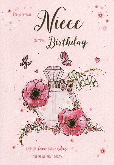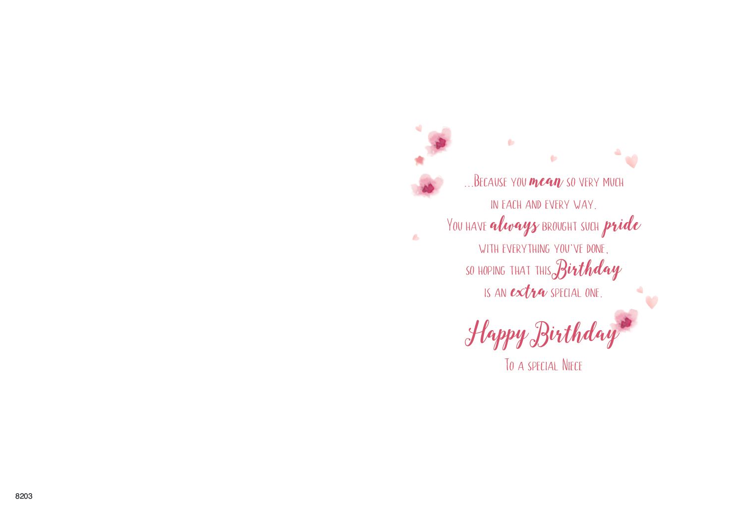 Verse reads: Front - Lots of love and wishes are being sent today... Inside - ...Because you mean so very much in each and every way. You have always brought such pride with everything you've done, so hoping that this birthday is an extra special one. Happy birthday to a special Niece