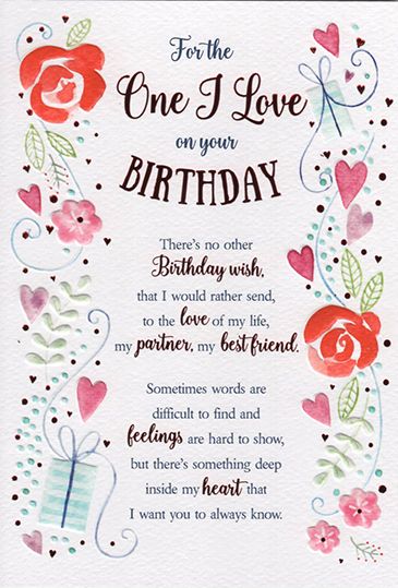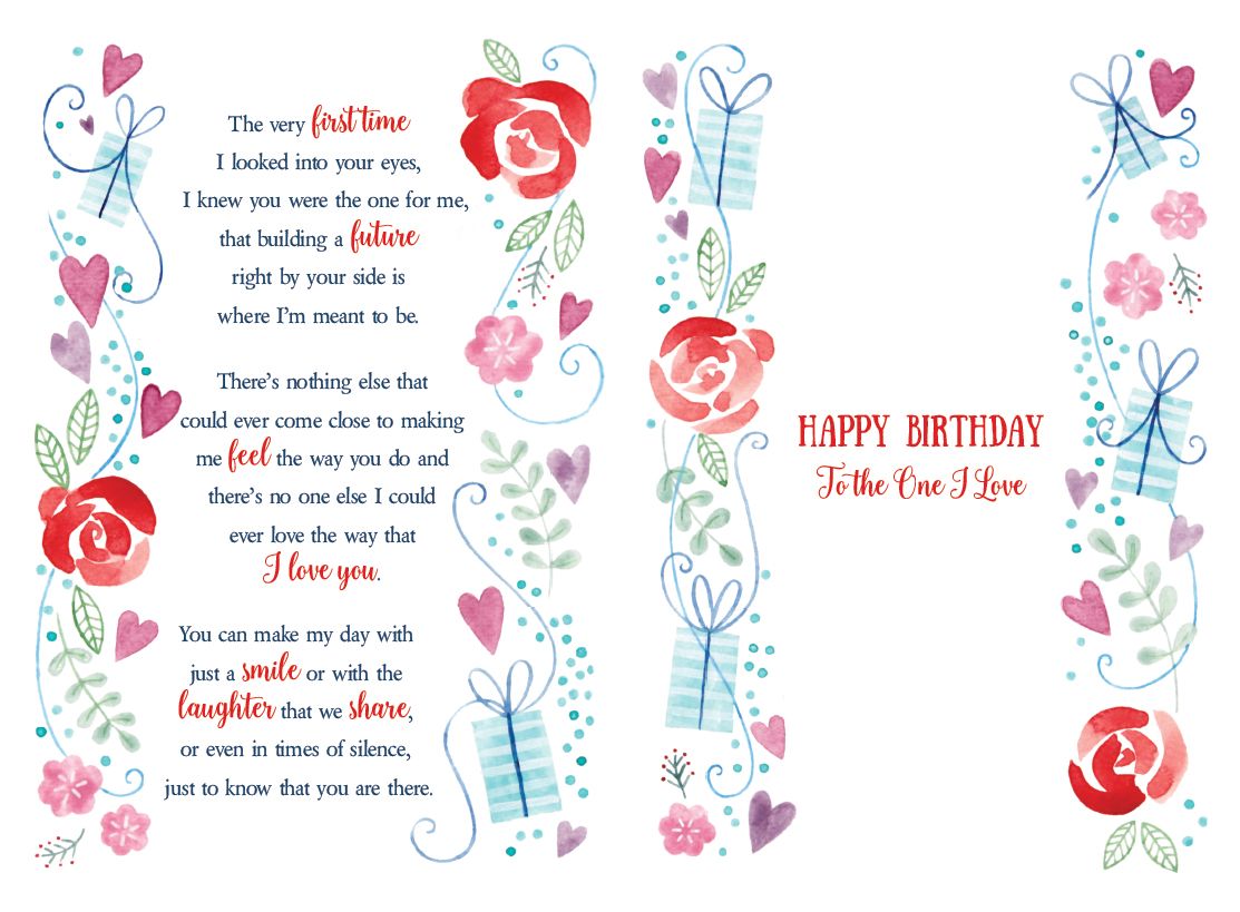 Verse reads: Front - There's no other birthday wish that I would rather send, to the love of my life, my partner, my bestfriend. Sometimes words are difficult to find and feelings are hard to show, but there's something deep inside my heart that I want you to always know. Inside - The very first time I looked into your eyes, I knew you were the one for me, that building a future right by your side is where I'm meant to be. There's nothing else that could ever come close to making me feel the way you do and there's no one else I could ever love the way that I love you. You can make my day with just a smile or with the laughter that we share, or even in times of silence, just know that you are there.