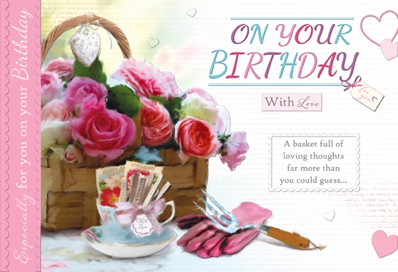 Verse reads: Front- A basket full of loving thought far more than you could guess...Inside- comes with special wishes for your birthday happiness. Especially for you Happy Birthday with love.