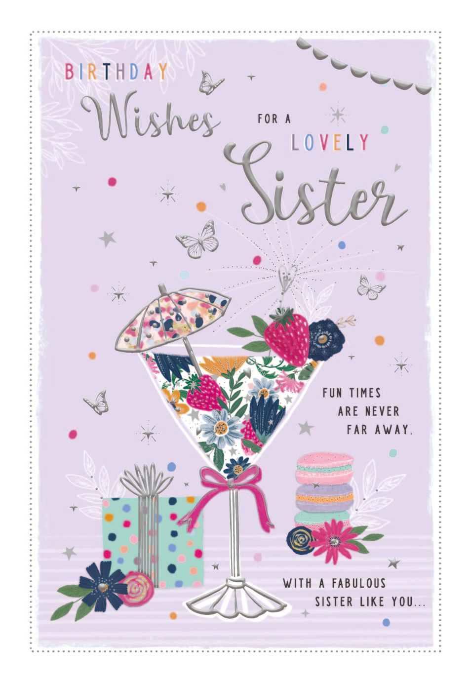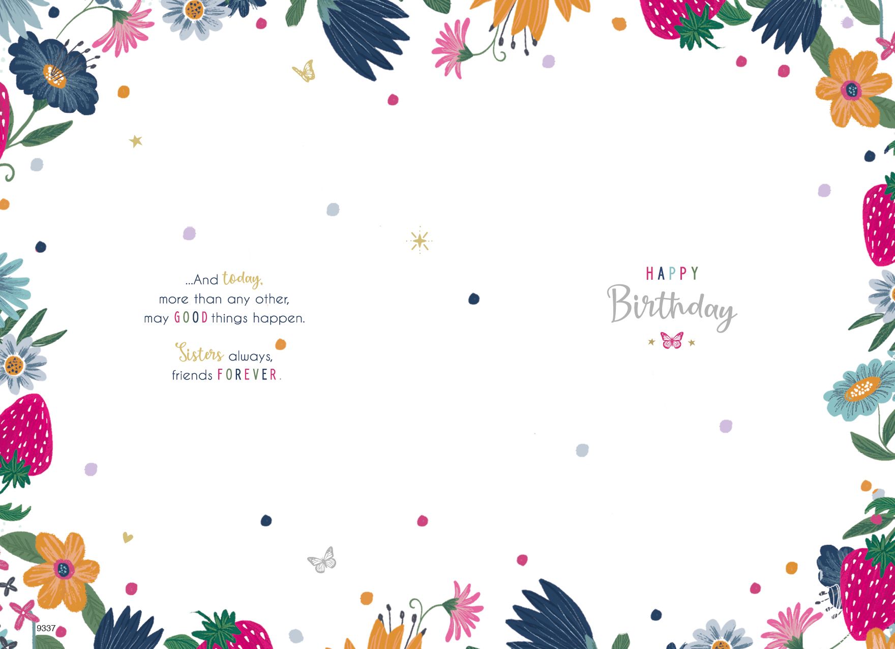 Verse reads: Front - Fun times are never far away with a fabulous Sister like you... Inside - ... And today, more than any other, may you find joy in all that you do. Sisters always, friends forever. Happy birthday