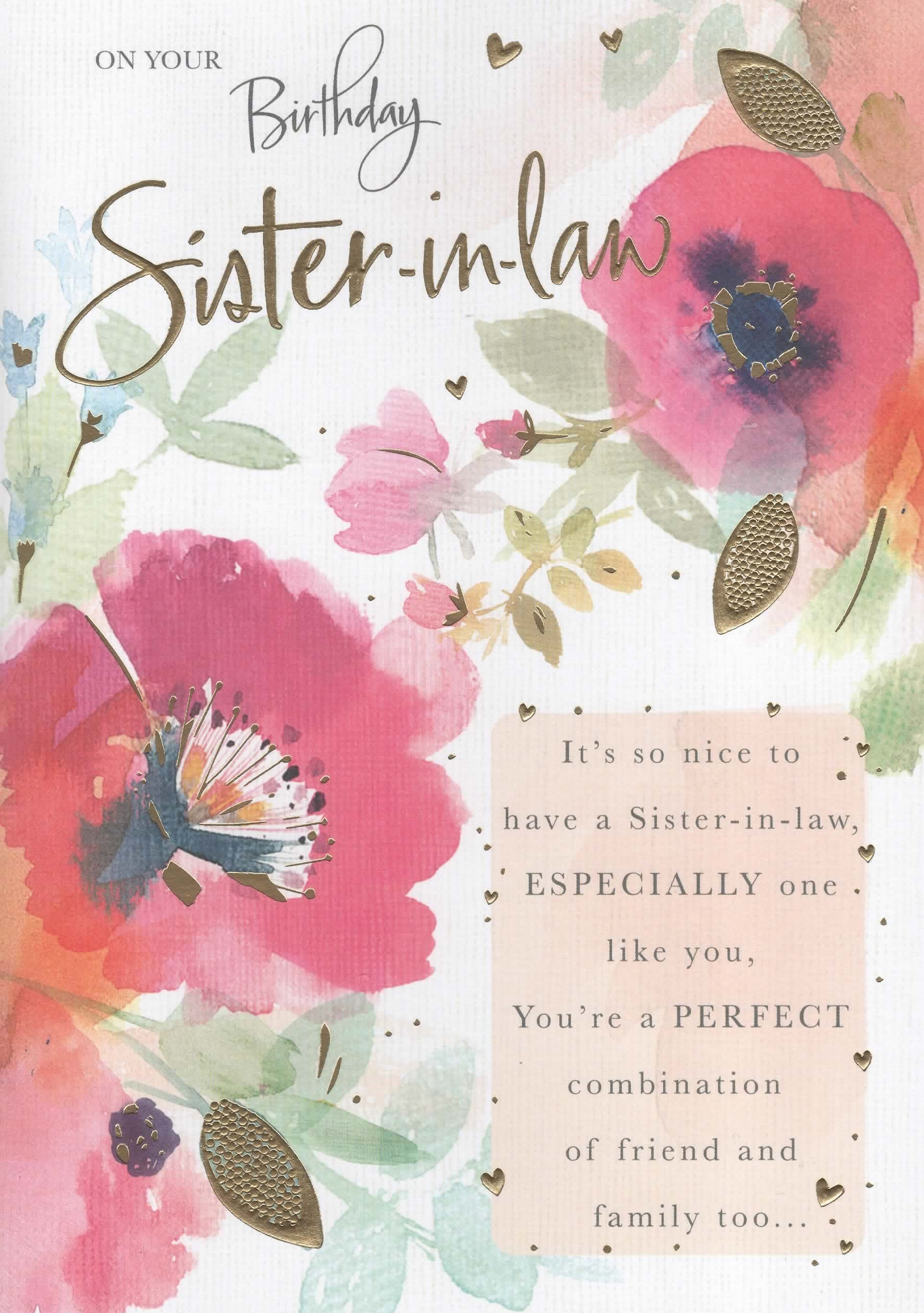 Verse reads: Front - It's so nice to have a Sister-in-Law, especially one like you, You're a perfect combination of a friend and family too... Inside - So it's nice to have a special time like your birthday just to say, This is bringing many happy thoughts and lots of love your way. Wishing you the happiest birthday and year full of happy days ahead.