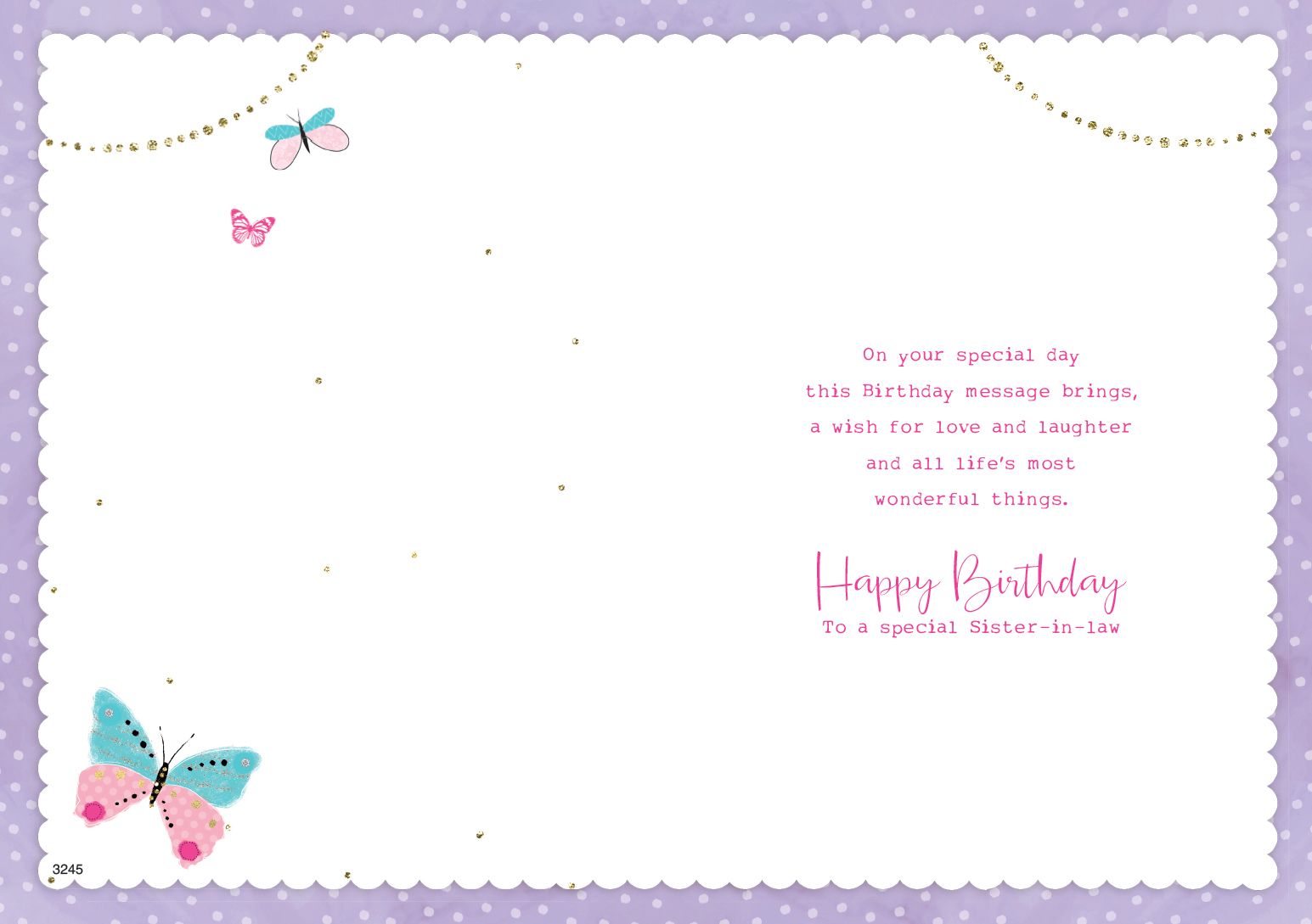 Verse reads: On your special day this birthday message brings, a wish for love and laughter and all life's most wonderful things. Happy Birthday to a special Sister-in-law