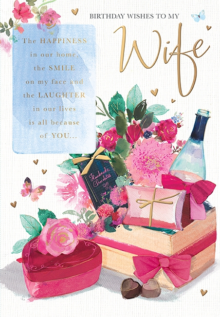 Verse reads: Front - The happiness in our home, the smile on my face and the laughter in our lives is all because of you... Inside - I'm so grateful to have found you and I hope that every beautiful moment of your birthday... Shows how much I love you and how special you are to me. Sending all my love today and always