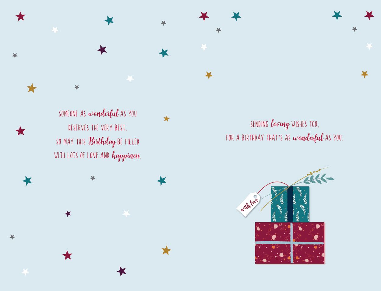 Verse reads: Front-It only takes a moment especially to say,you make me so happy in each and every way.. Inside: it's the perfect time to tell you now that your birthday is here. That you are loved so very much each day throughout the year. For you are so loving so kind and caring too..It really means so much to me...to share this special day with you...Someone as wonderful as you deserves the very best. So may this birthday be filled with lots of love and happiness. Sending loving wishes too. For a birthday that's as wonderful as you. Here's a birthday wish for you to always know, that you mean so much more than words could ever show. With all my love on your Birthday.