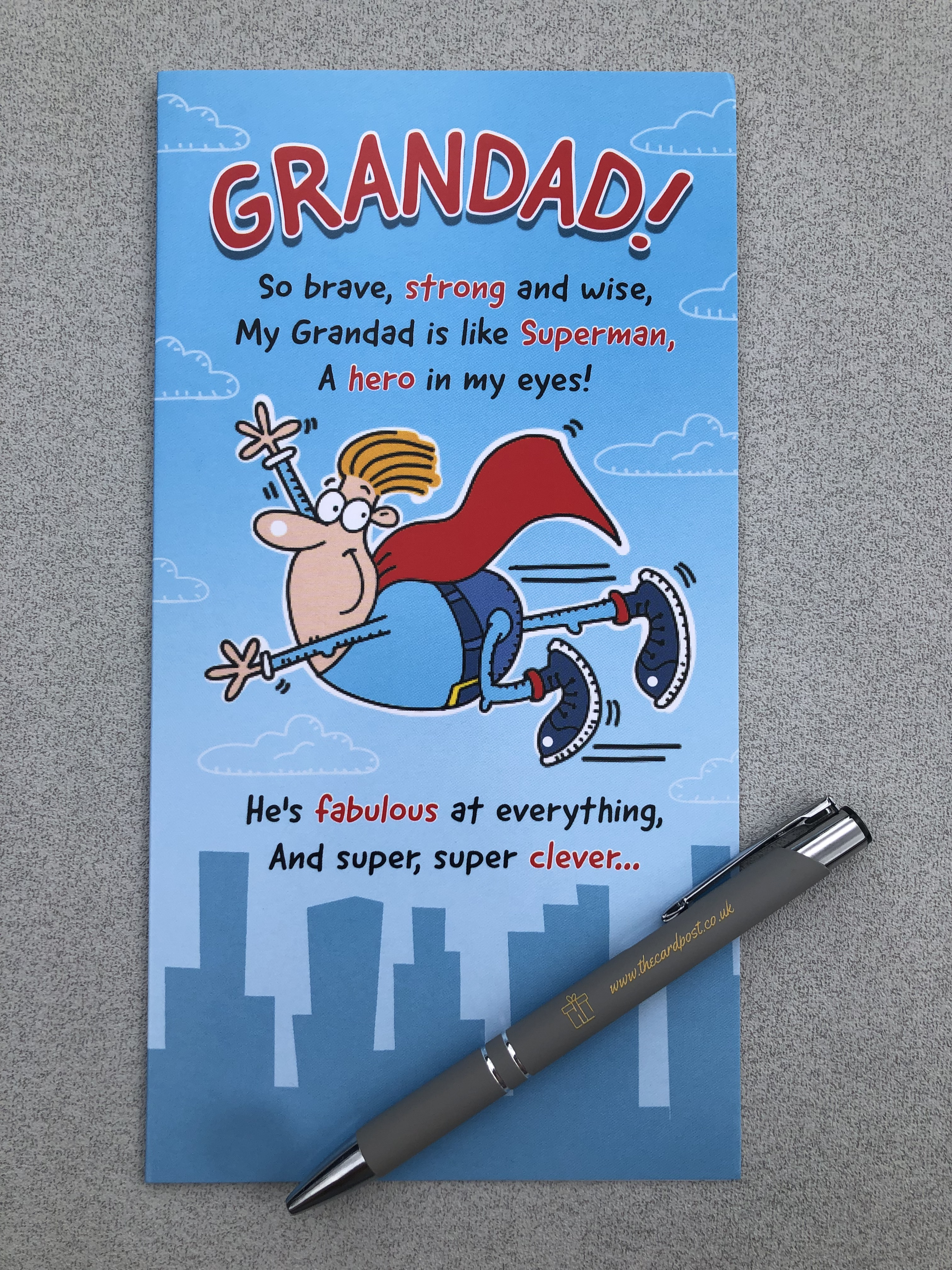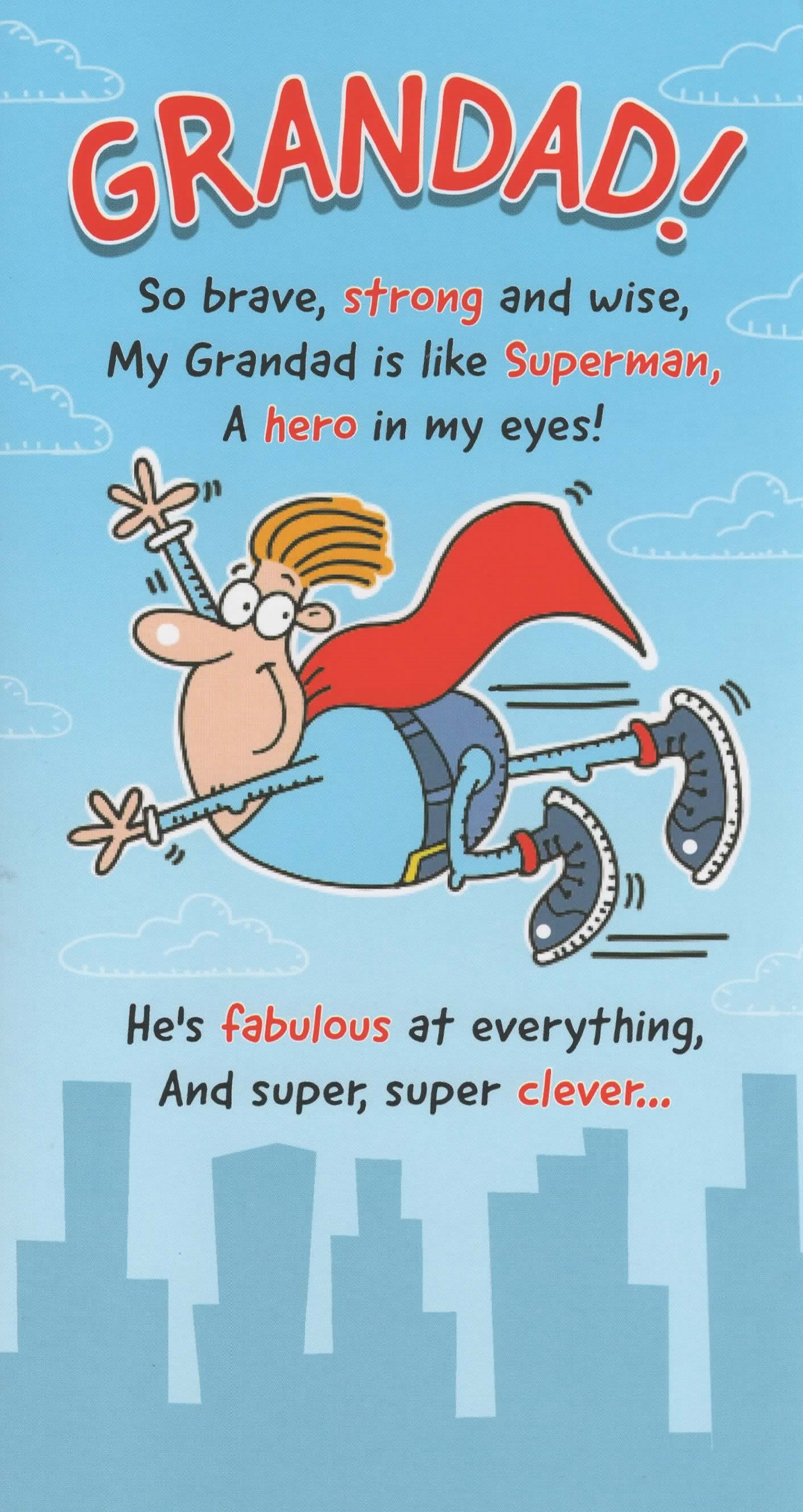 Verse reads: Front - So brave, strong and wise, My Grandad is like superman, A hero in my eyes! He's fabulous at everything, And super, super clever... Inside - ...and I'm his super grandkid, So he's the luckiest grandad ever! Happy Birthday Grandad... You're the best!