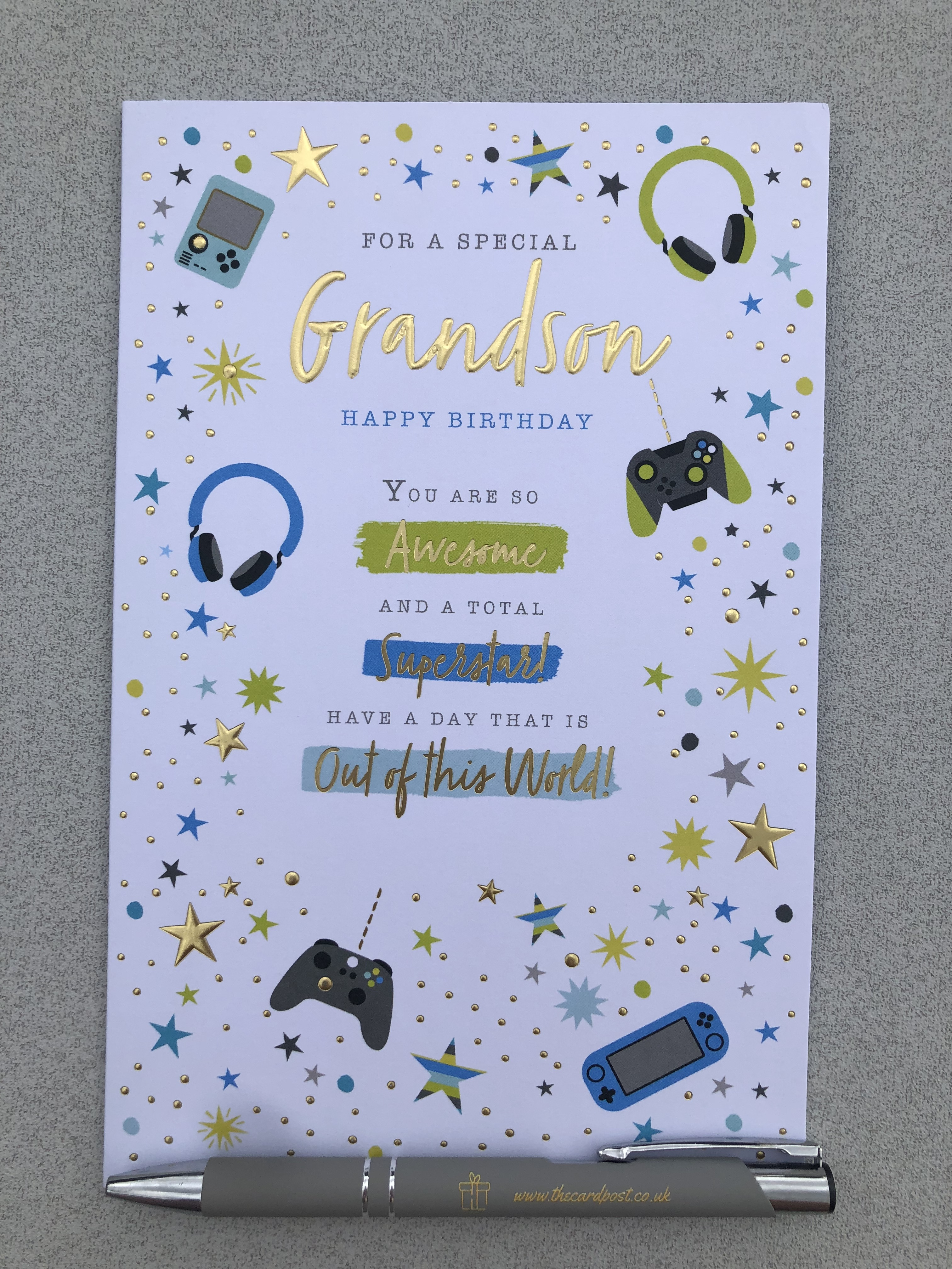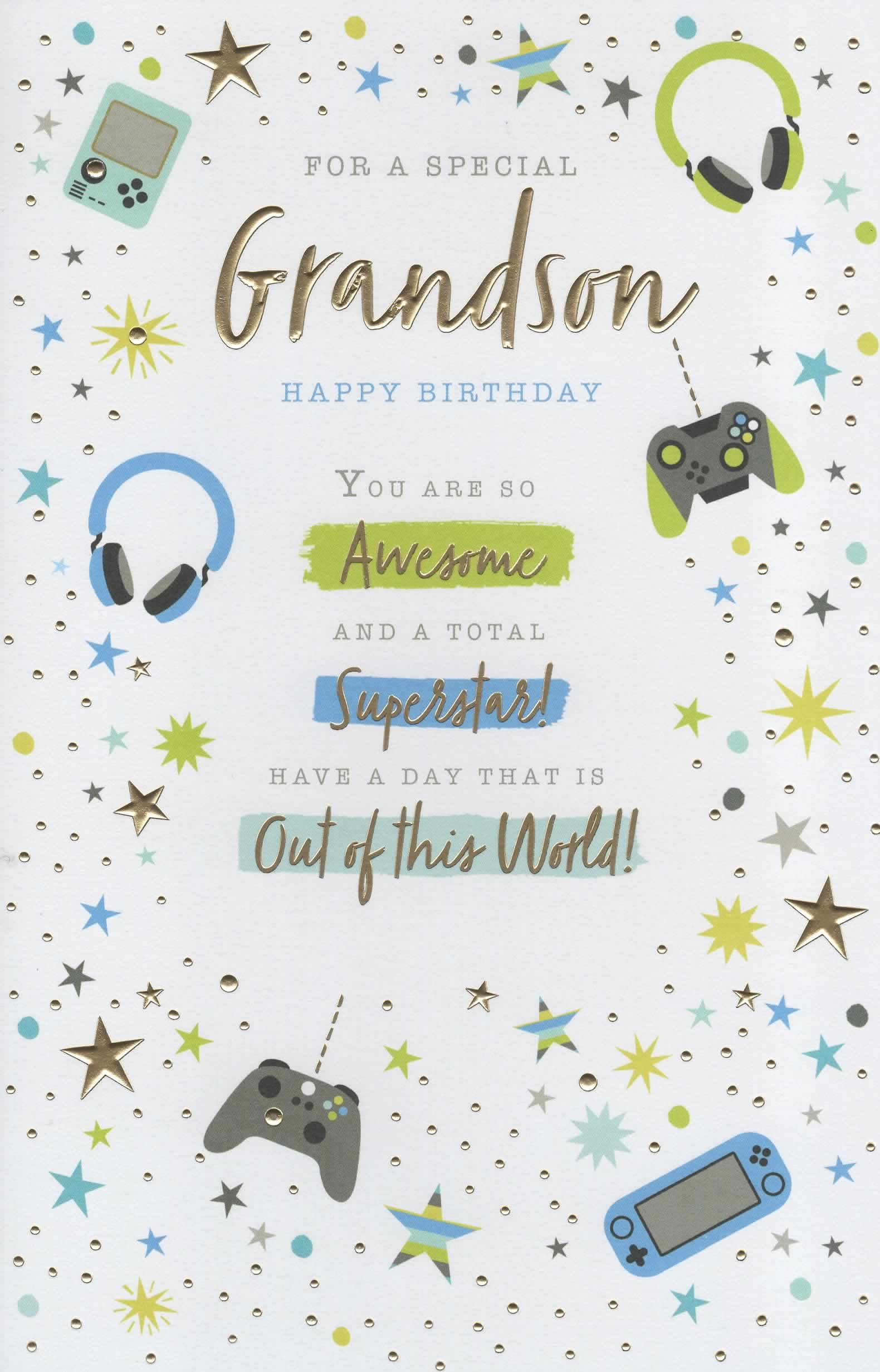Verse reads: Front - You are so awesome and a total superstar! Have a day that is out of this world! Inside - For a special Grandson Have the best Birthday!