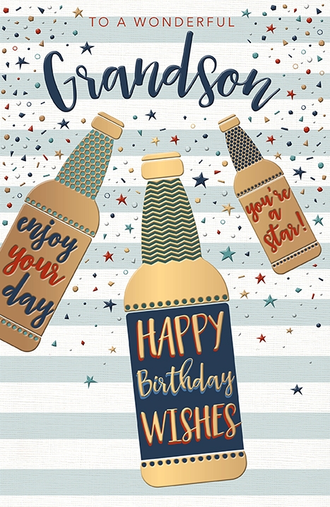Verse reads: Perhaps you'll have some drinks, try out the latest party trends, or maybe you'll relax and have a catch-up with your friends. Perhaps you'll spend it smiling, but whatever you decide - You'll always be a Grandson who fills our hearts with pride. With love on your birthday