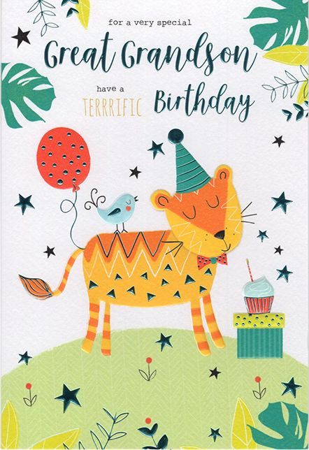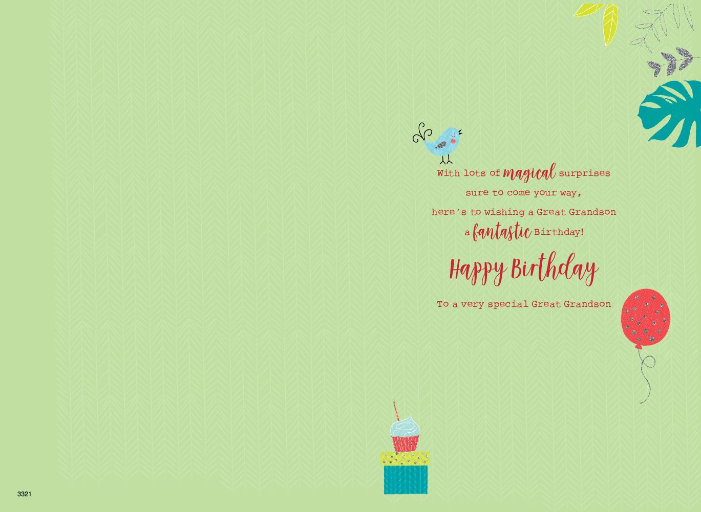 Verse reads: with lots of magical surprises sure to come your way, here's to wishing a Great Grandson a fantastic Birthday! Happy Birthday to a very special Great Grandson