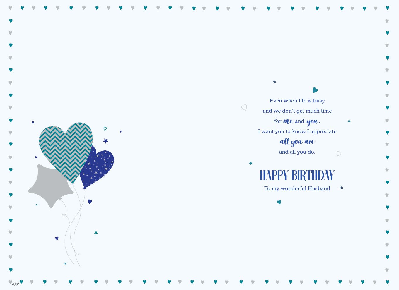 Verse reads: Even when life is busy and we don't get much time for me and you, I want you to know I appreciate all you are and all you do. Happy Birthday to my wonderful Husband