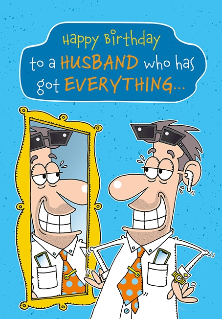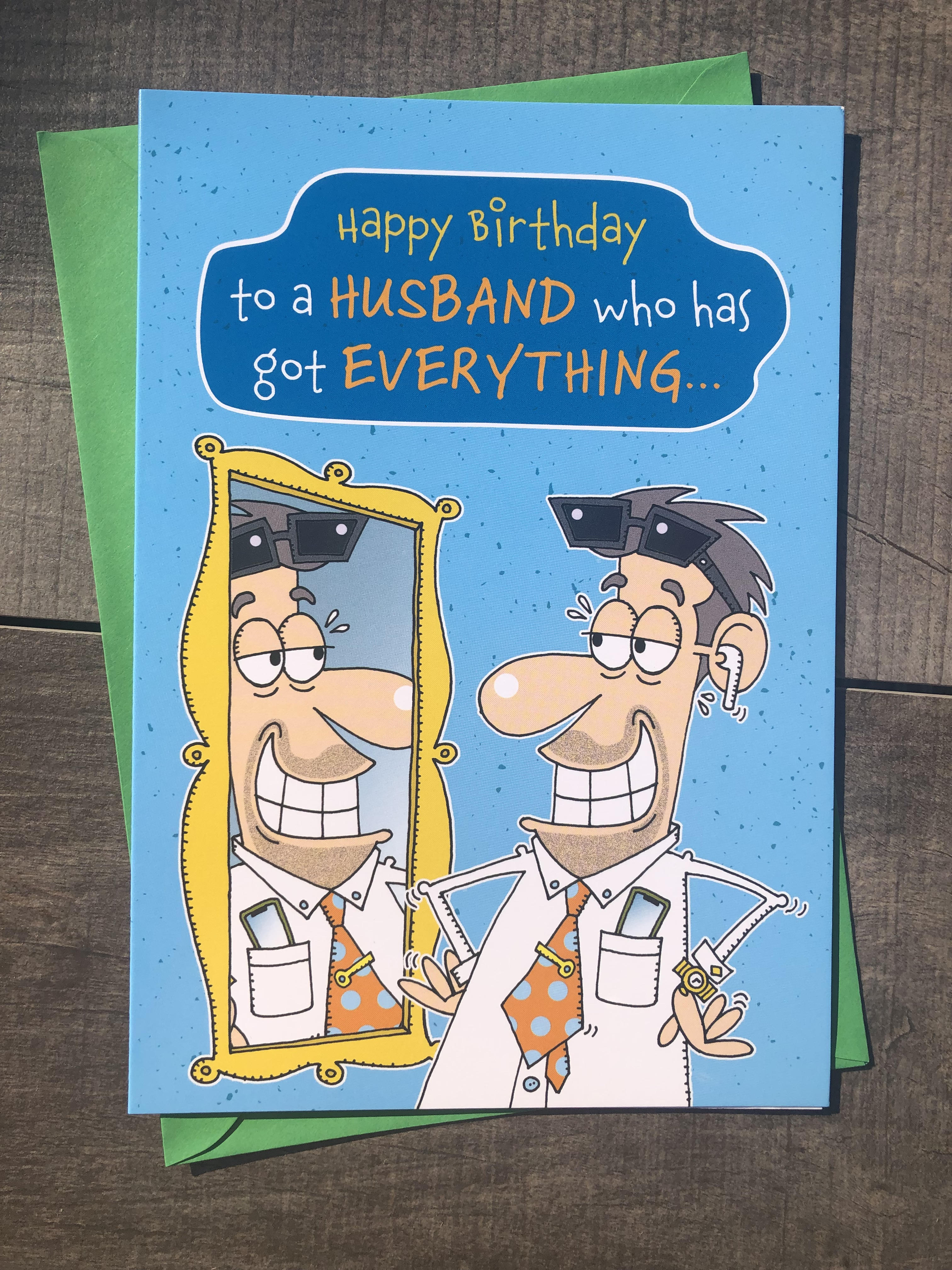 Verse reads: Front- Happy Birthday to a husband who has everything...Inside-from the wife who has to find it for you! Have a fantastic Birthday