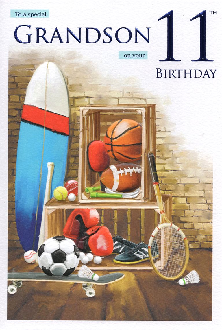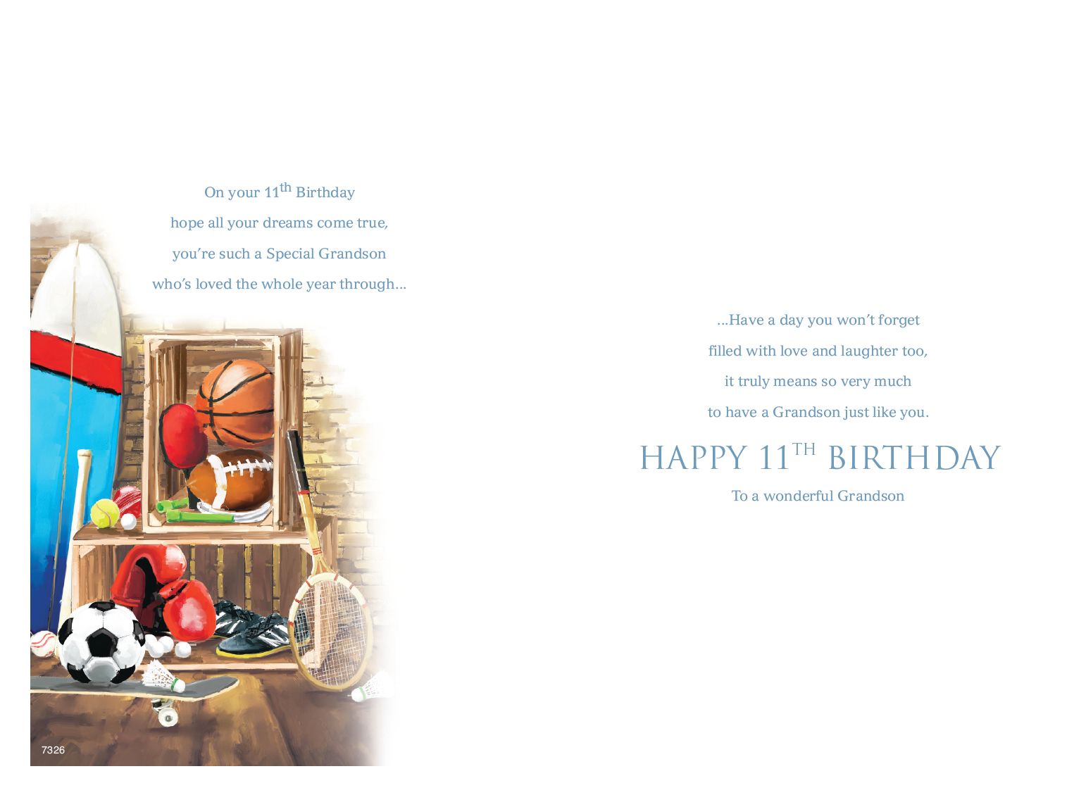 Verse reads: On your 11th birthday hope all your dreams come true, you're such a special Grandson who's loved the whole year through... ...Have a day you won't forget filled with love and laughter too, it truly means so very much to have a Grandson just like you. Happy 11th Birthday to a wonderful Grandson