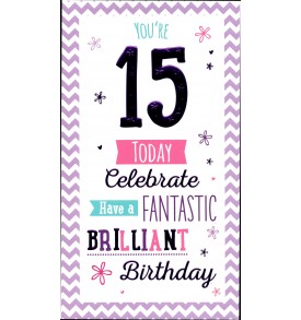 Verse reads: Lots of Birthday wishes are sent to you tody, for laughter, love and happiness to fill your special day. Happy 15th Birthday