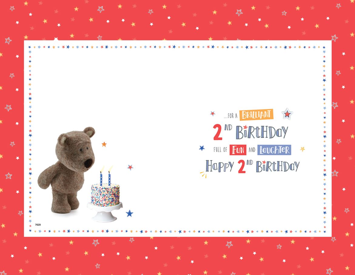 Verse reads: Front - Sending you a big birthday wish... Inside - ...For a brilliant 2nd Birthday Full of fun and laughter