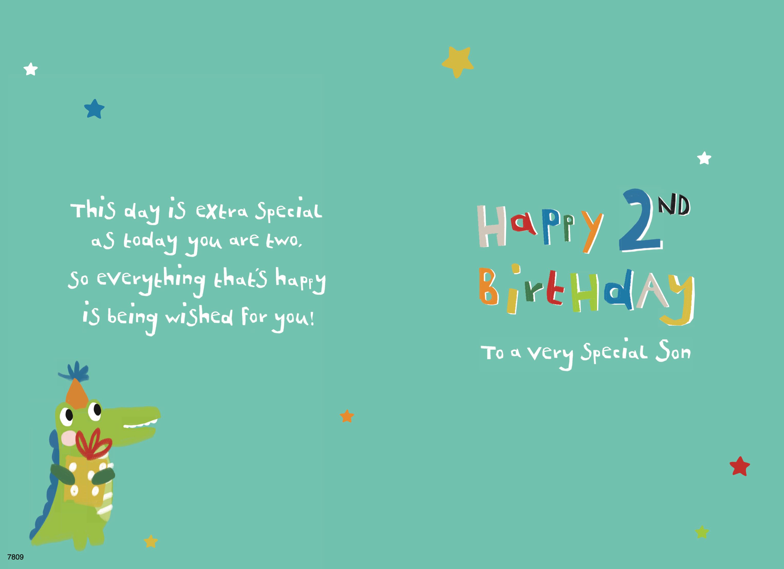 Verse reads: This day is extra special as today you are two, so everything that's happy is being wished for you! Happy 2nd Birthday to a very special Son