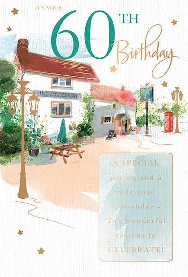 Verse reads: Front- A Special person and a milestone birthday - Two wonderful reasons to celebrate! Inside- Enjoy each moment of your birthday, may it be the best one by a mile, a wonderful occasion that you celebrate in style! Happy 60th Birthday