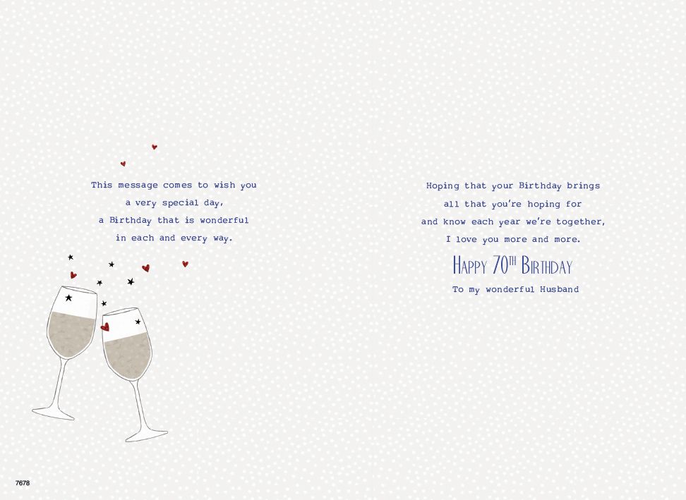 Verse reads: This message comes to wish you a very special day, a birthday that is wonderful in each and every way. Hoping that your birthday brings all that you're hoping for and know each year we're together, I love you more and more. Happy 70th birthday to my wonderful Husband