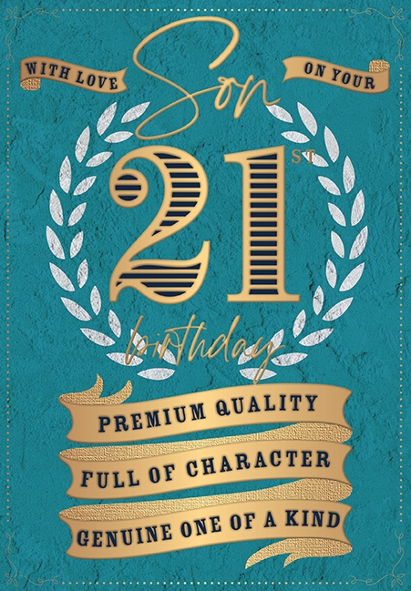 Verse reads: Front - Premium quality Full of Character Genuine One of a Kind Inside - Today you're turning twenty one, a wonderful event, that's why congratulations and loving wishes are being sent... Wishes for your happiness and success in all you do, Hoping all your hopes and dreams turn out just right for you. 21st birthday wishes for a wonderful Son