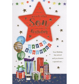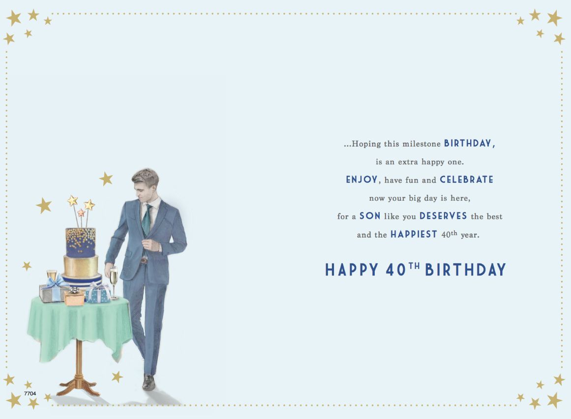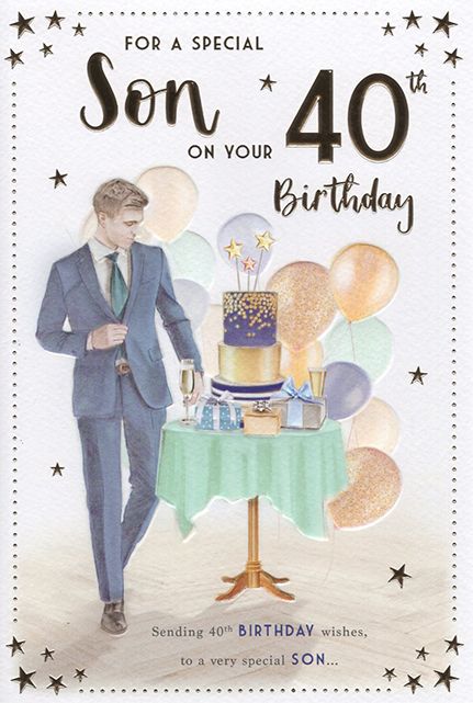 Verse reads: Front - Sending 40th Birthday wishes, to a very special Son... Inside - ...Hoping this milestone birthday is an extra happy one. Enjoy, have fun and celebrate now your big day is here, for a Son like you deserves the best and the happiest 40th year. Happy 40th Birthday