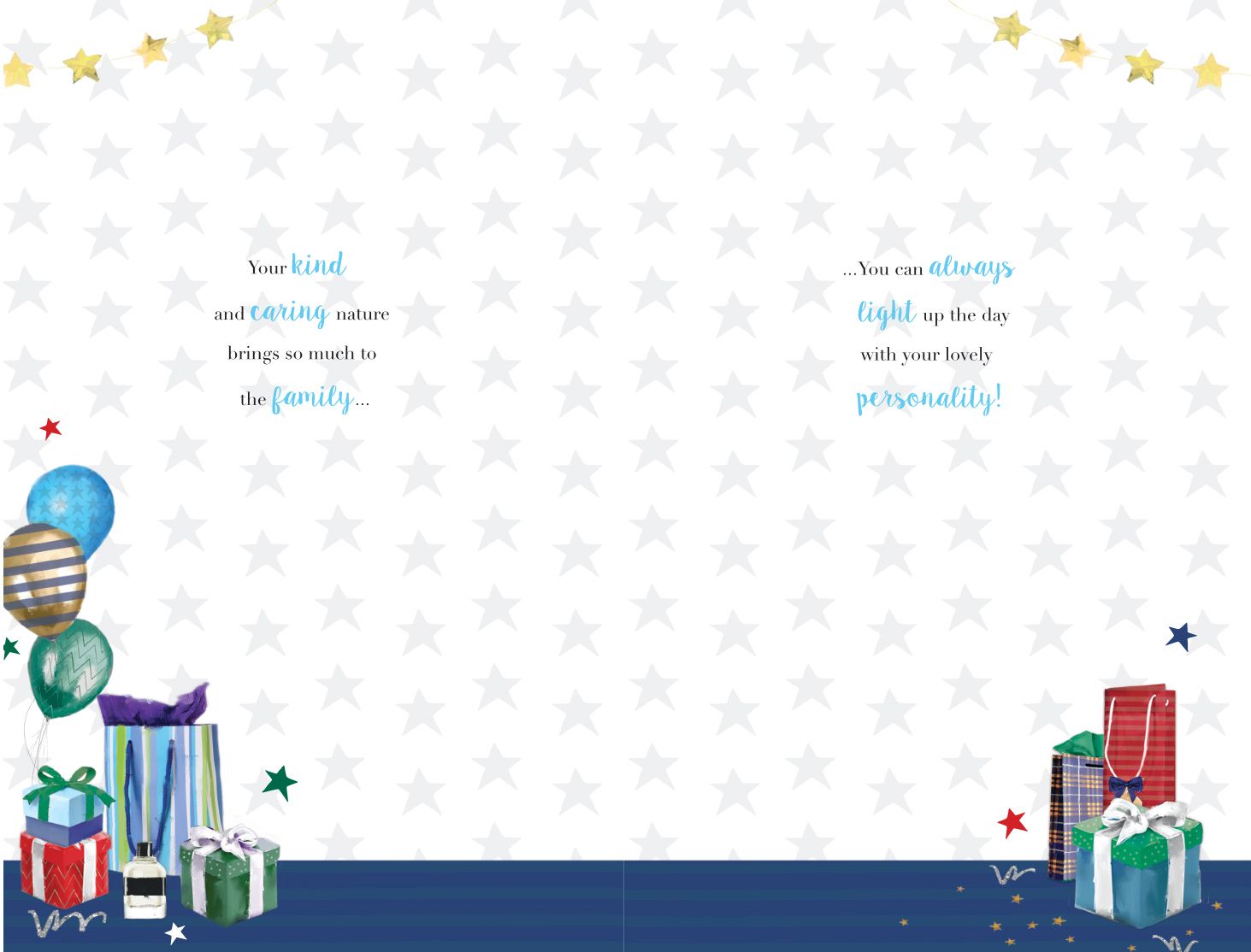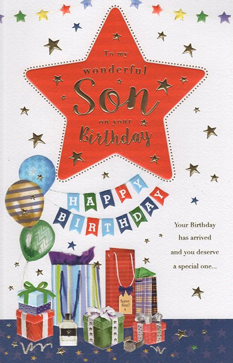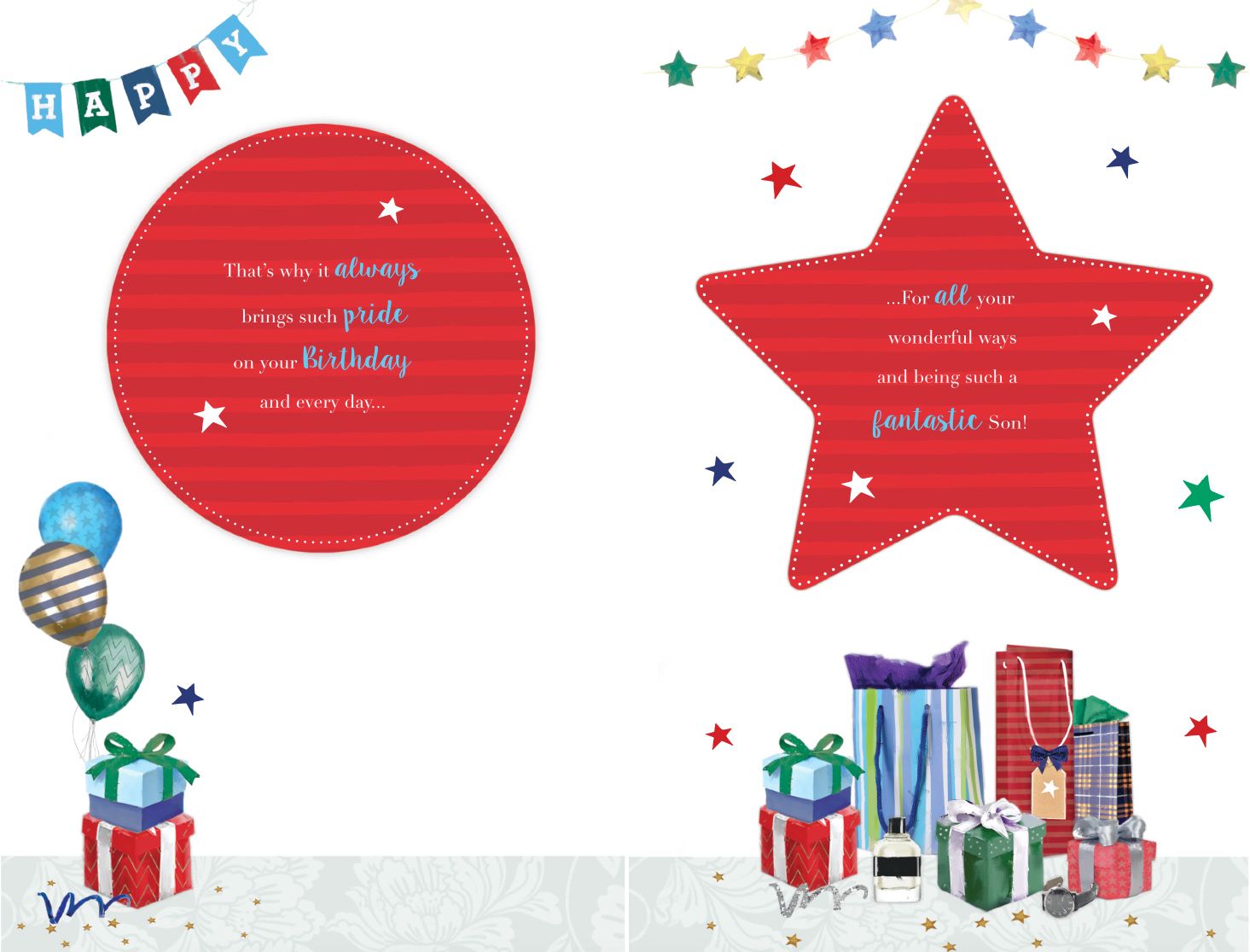 Verse reads: Front... Your Birthday has arrived and you deserve a special one... Inside- For all your wonderful ways and being such a fantastic Son! Your kind and caring nature brings so much to the family... You can always light up the day with your lovely personality! That's why it always brings such pride on your Birthday and every day... To have you as a Son and wish you happiness in every way. Have the most wonderful Birthday.