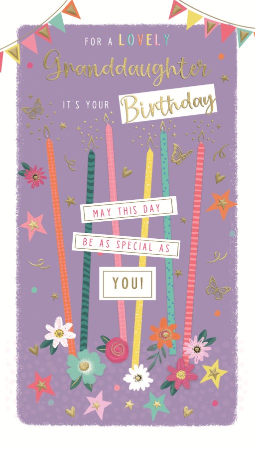 Granddaughter Birthday - Slimline Card - Bright Candles - Flowers - Purple