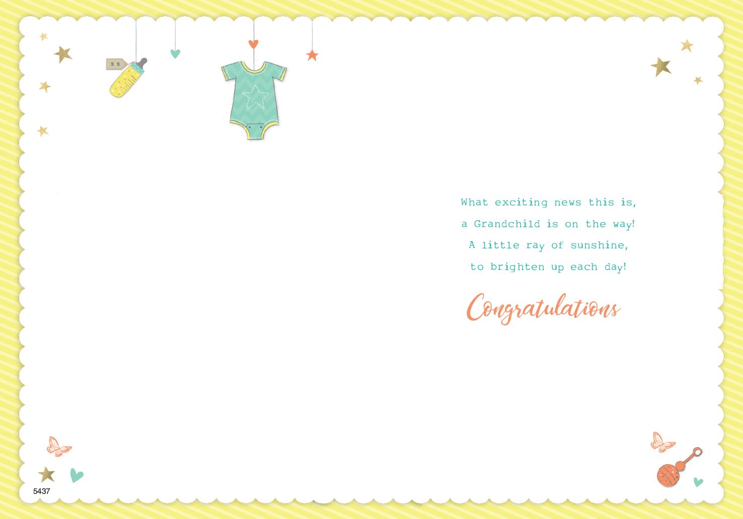Verse reads: What exciting news this is, a Grandchild is on the way! A little ray of sunshine, to brighten up each day! Congratulations