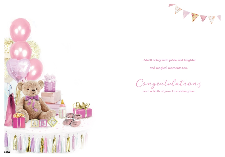 Verse reads: Front - She'll fill you with happiness with all the things she'll do...Inside - she'll bring such pride and laughter and magical moments too. Congratulations on the birth of your Granddaughter
