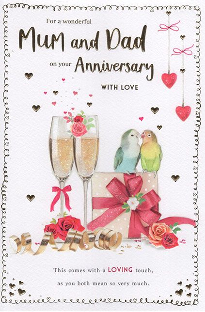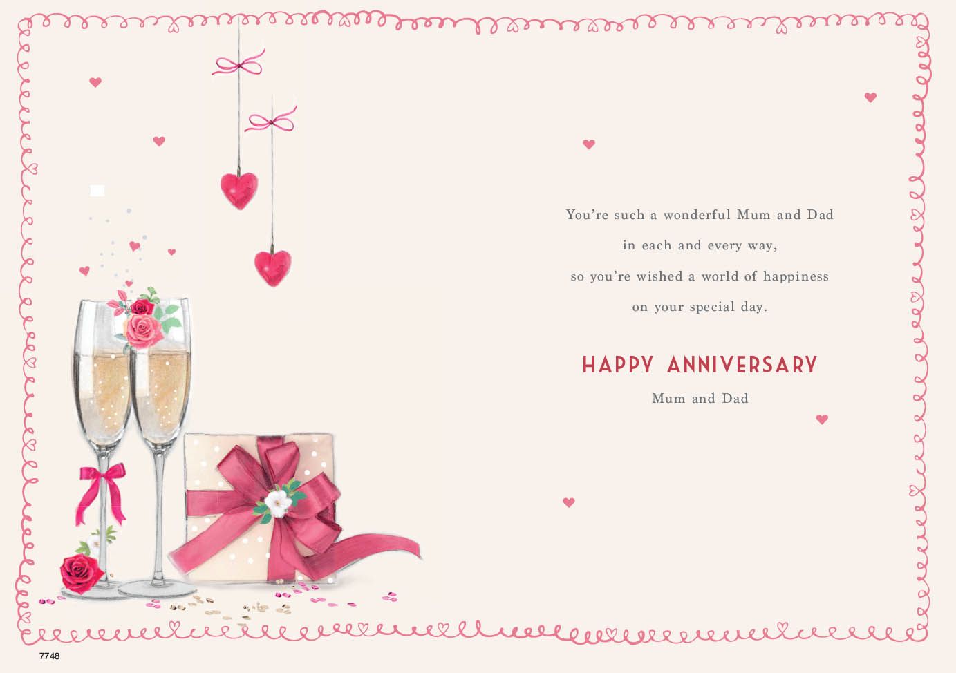 Verse reads: Front- This comes with a loving touch, as you both means so very much...Inside- You're such a wonderful Mum and Dad in each and every way, so you're wished a world of happiness on your special day. happy anniversary Mum and Dad