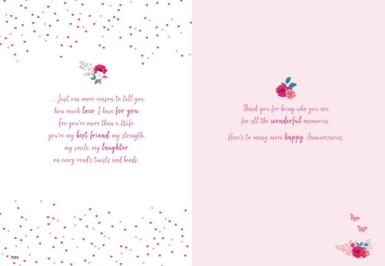Verse reads: Front- Another year to celebrate the day we said 'I do'...Inside_ Just one reason to tell you how much love I have for you. For you're my best friend my strength, my smile, my laughter on every road's twists and bends. Thank you for being who you are, for all the wonderful memories. Here's to many more happy anniveraries.