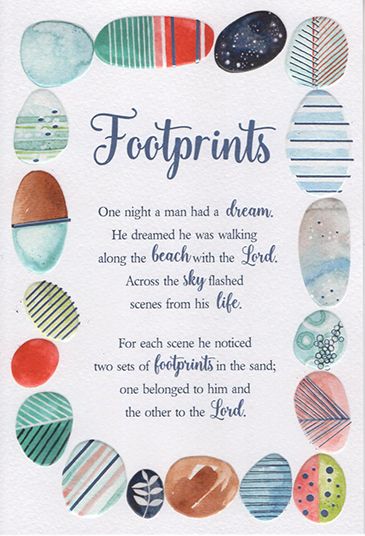 Verse reads: Front - Footprints One night a man had a dream. He dreamed he was walking along the beach with the Lord. Across the sky flashed scenes of his life. For each scene he noticed two sets of footprints in the sand; one belonged to him and the other to the Lord.