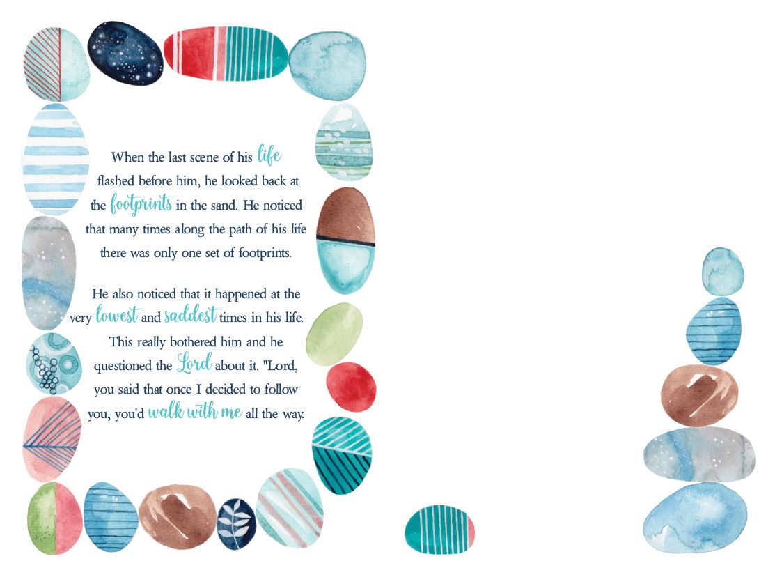 Inside - When the last scene of his life flashed before him, he looked back at the footprints in the sand. He noticed that many times along the path of his life there was only one set of footprints. He also noticed that it happened at the very lowest and saddest times in his life. This really bothered him and he questioned the Lord about it. "Lord, you said that once I decided to follow you, you'd walk with me all the way.