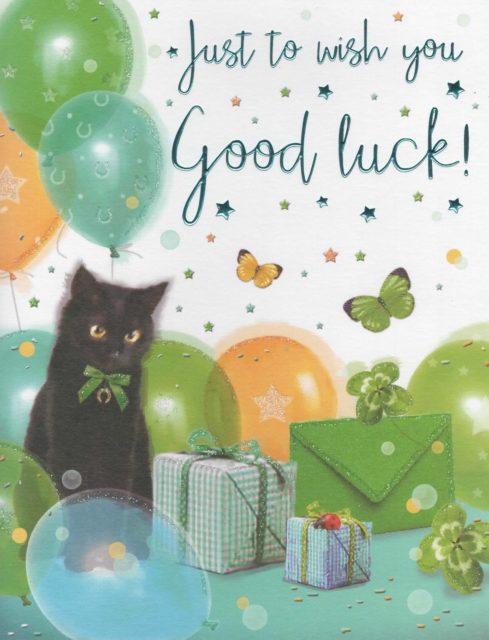 Good Luck - Black Cat - Green Balloons and Clover