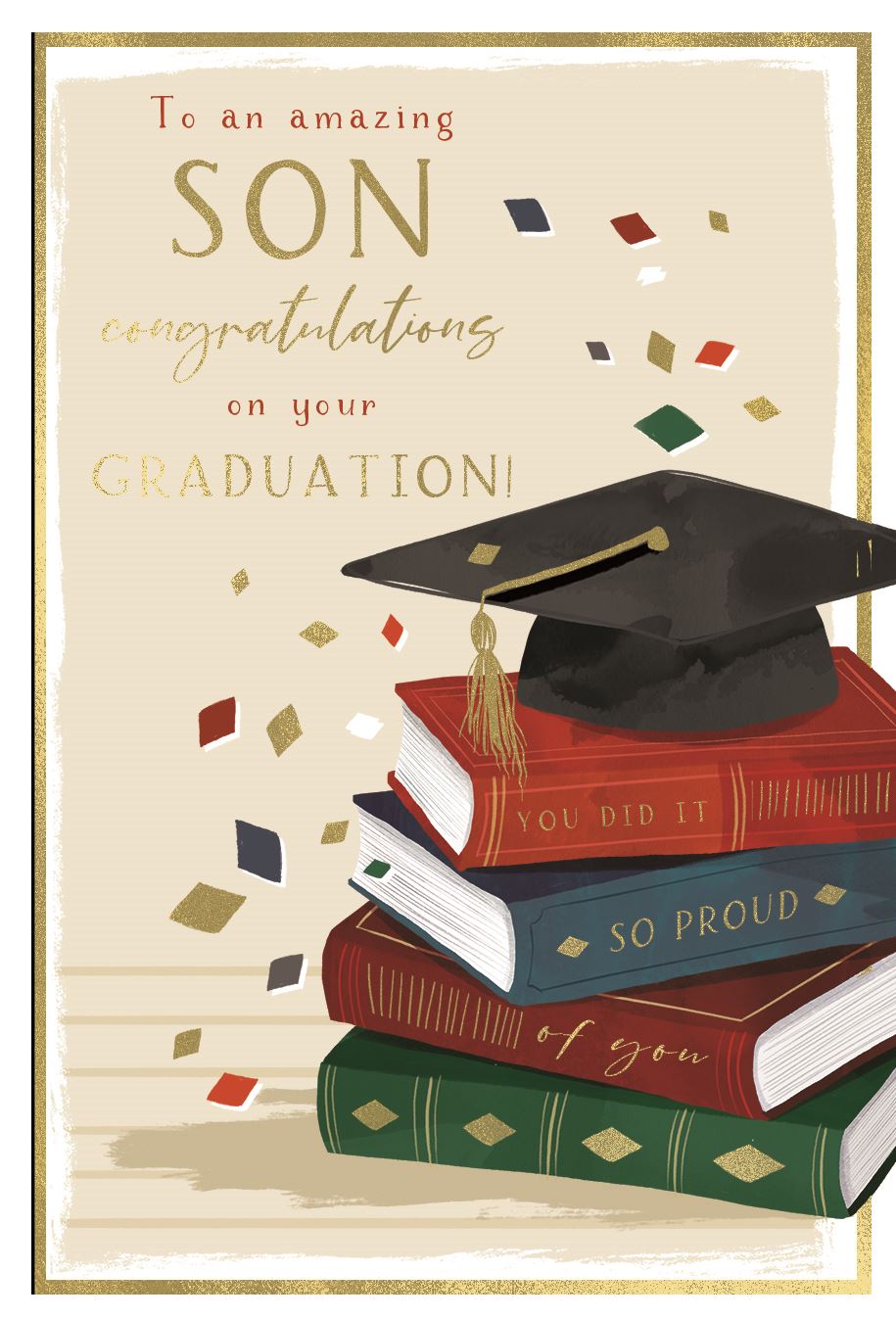Son Graduation - Congratulations - Graduation Cap and Exam Books