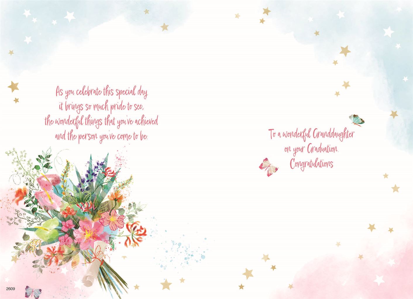 Verse: As you celebrate this special day it brings so much pride to see, the wonderful things you've achieved and the person you've come to be To a wonderful Granddaughter on your Graduation Congratulations
