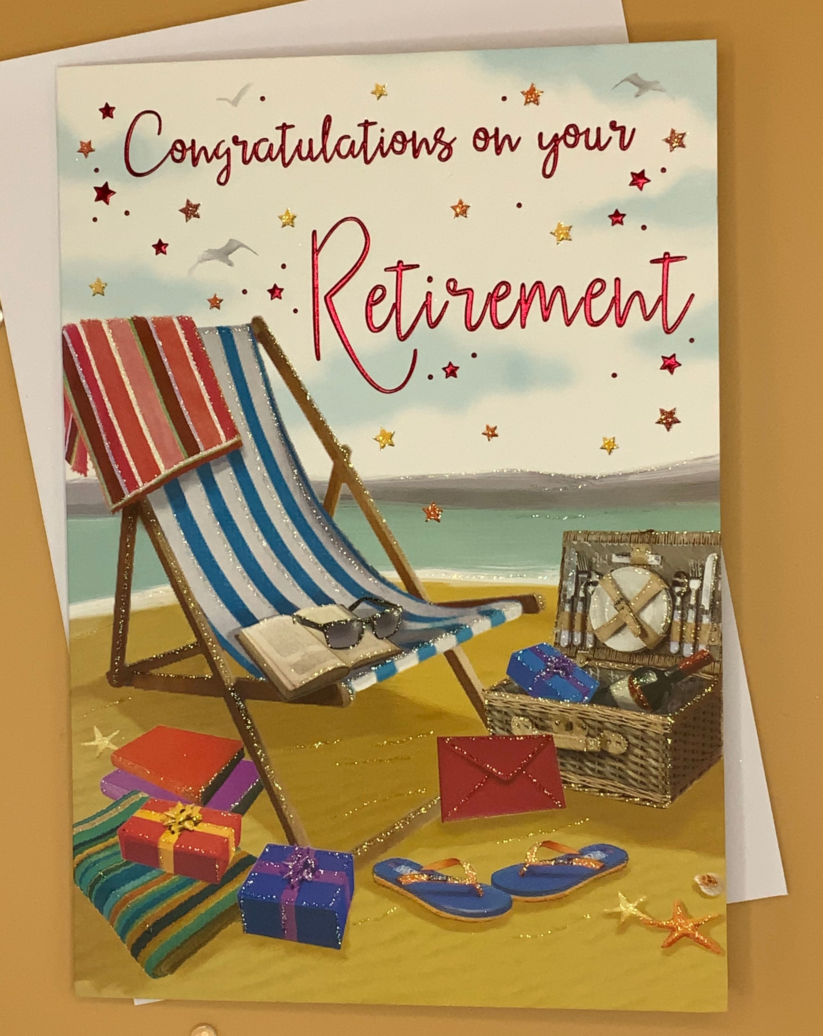 Verse reads: As one life chapter closes and you embark on something new You've earned your new found freedom there's so much to look forward to Time to do all those exciting things you always wished you could Relax, enjoy peace and quiet the retired life is good! Congratulations on your retirement