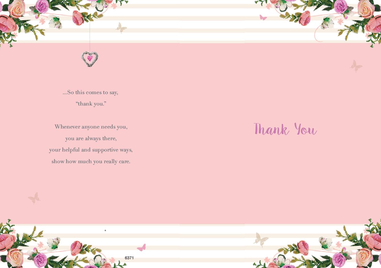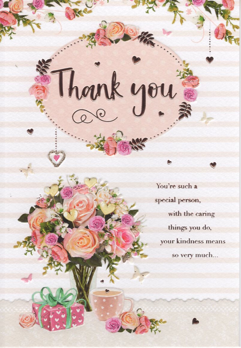 Verse reads: Front - You're such a special person, with the caring things you do, your kindness means so very much... Inside - ...So this comes to say, "thank you". Whenever anyone needs you, you are always there, your helpful and supportive ways, show how much you really care. Thank you