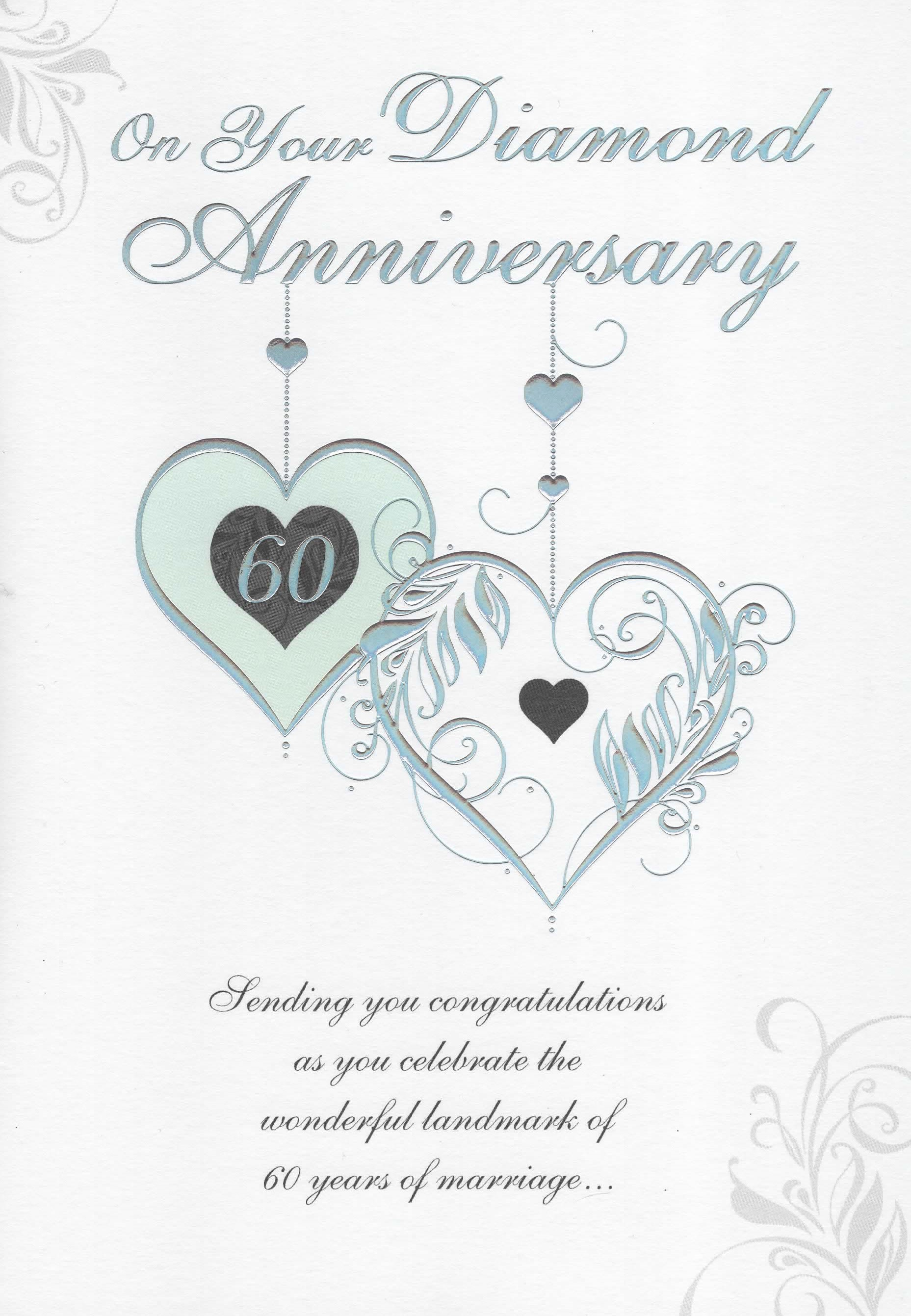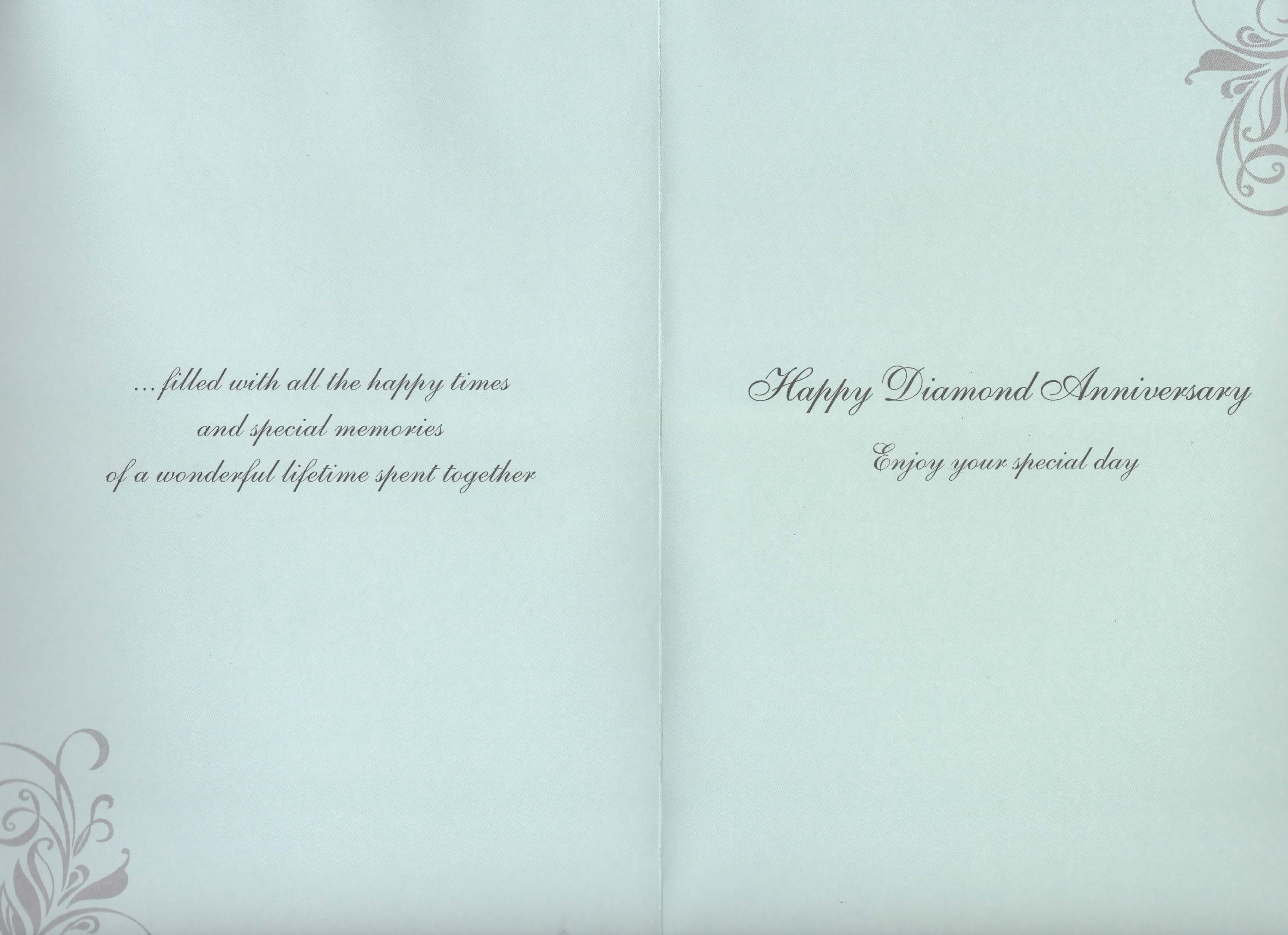Verse reads: Front - Sending you congratulations as you celebrate the wonderful landmark of 60 years of marriage... Inside - ...filled with all the happy times and special memories of a wonderful lifetime spent together Happy Diamond Anniversary Enjoy your special day