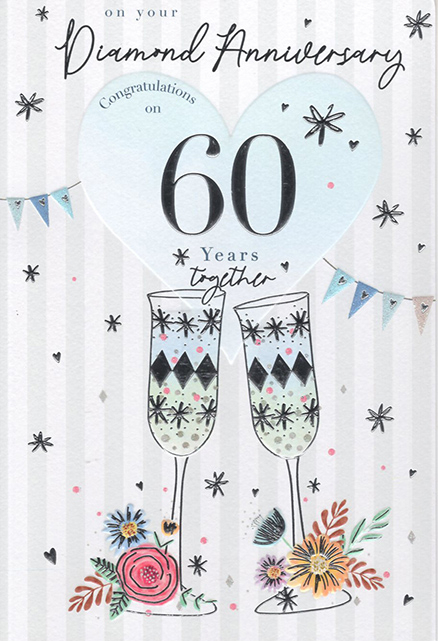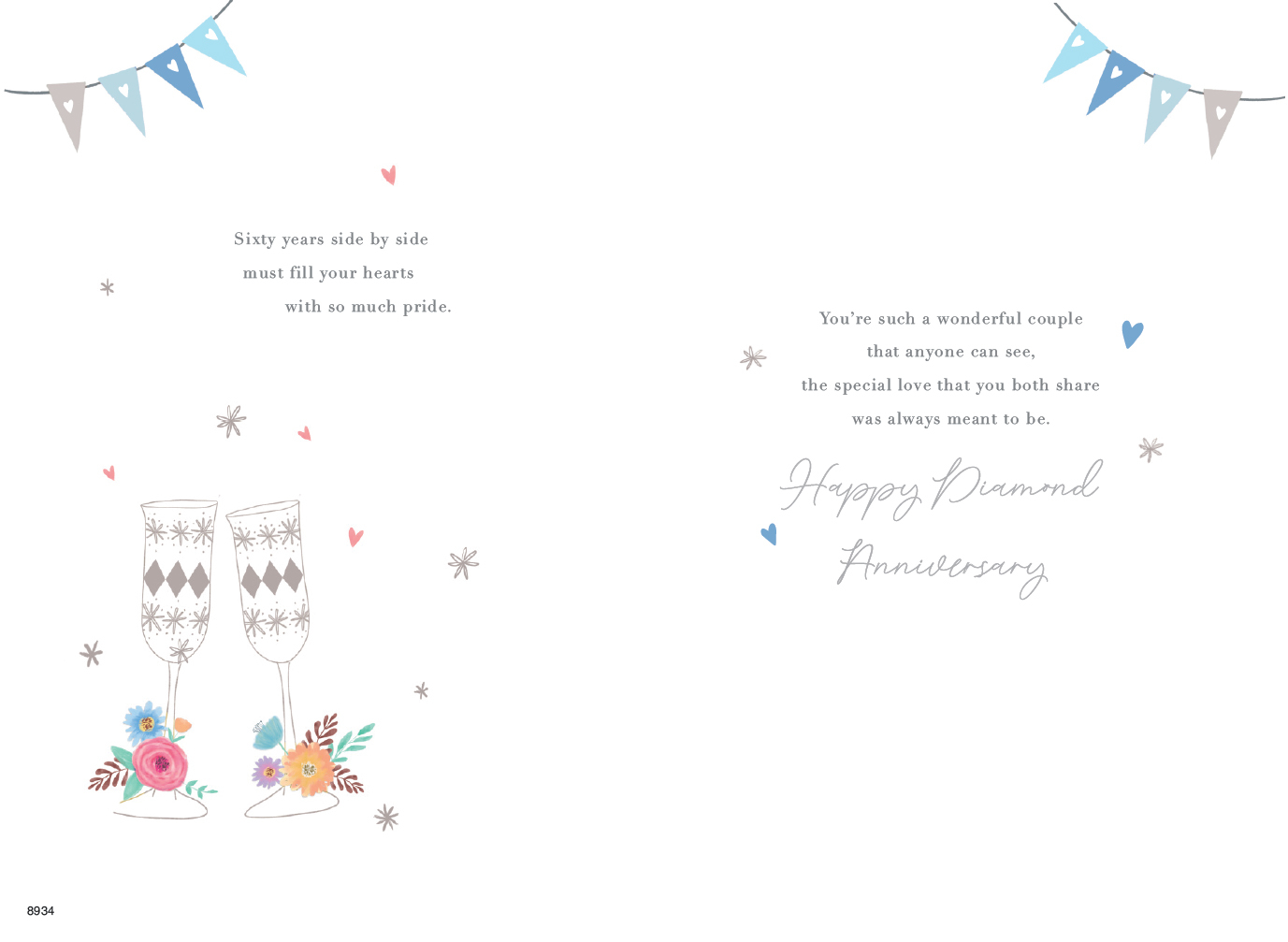 Verse reads: Front - Congratulations on 60 years together Inside - Sixty years side by side must fill your hearts with so much pride. You're such a wonderful couple that anyone can see, the special love that you both share was always meant to be. Happy Diamond Anniversary