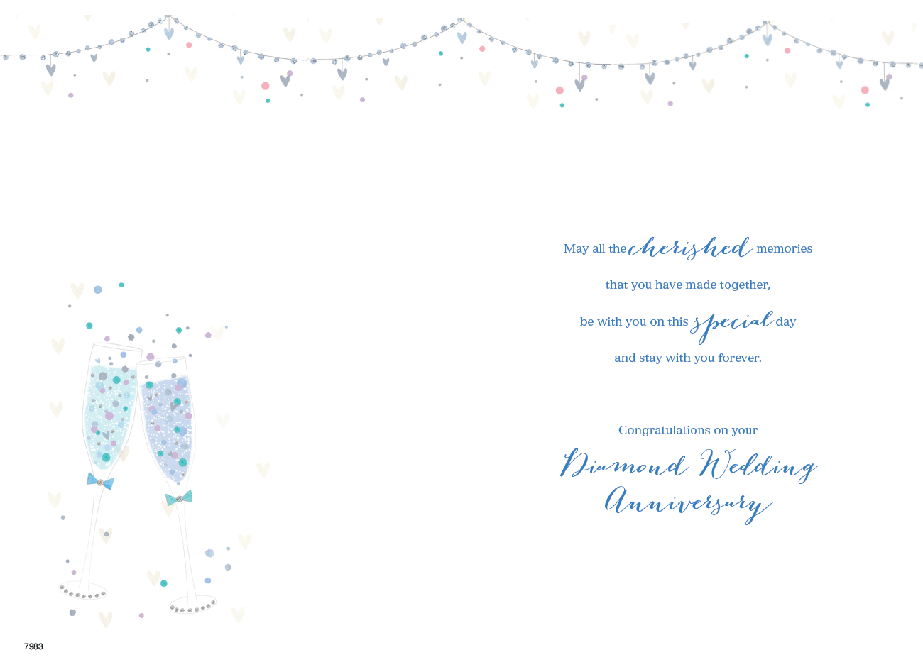 Verse reads: Front - Sending 60th Anniversary wishes especially for you, wishing you both a wonderful day that is perfect through and through Inside - May all the cherished memories that you have made together, be with you on this special day and stay with you forever. Congratulations on your Diamond Wedding Anniversary
