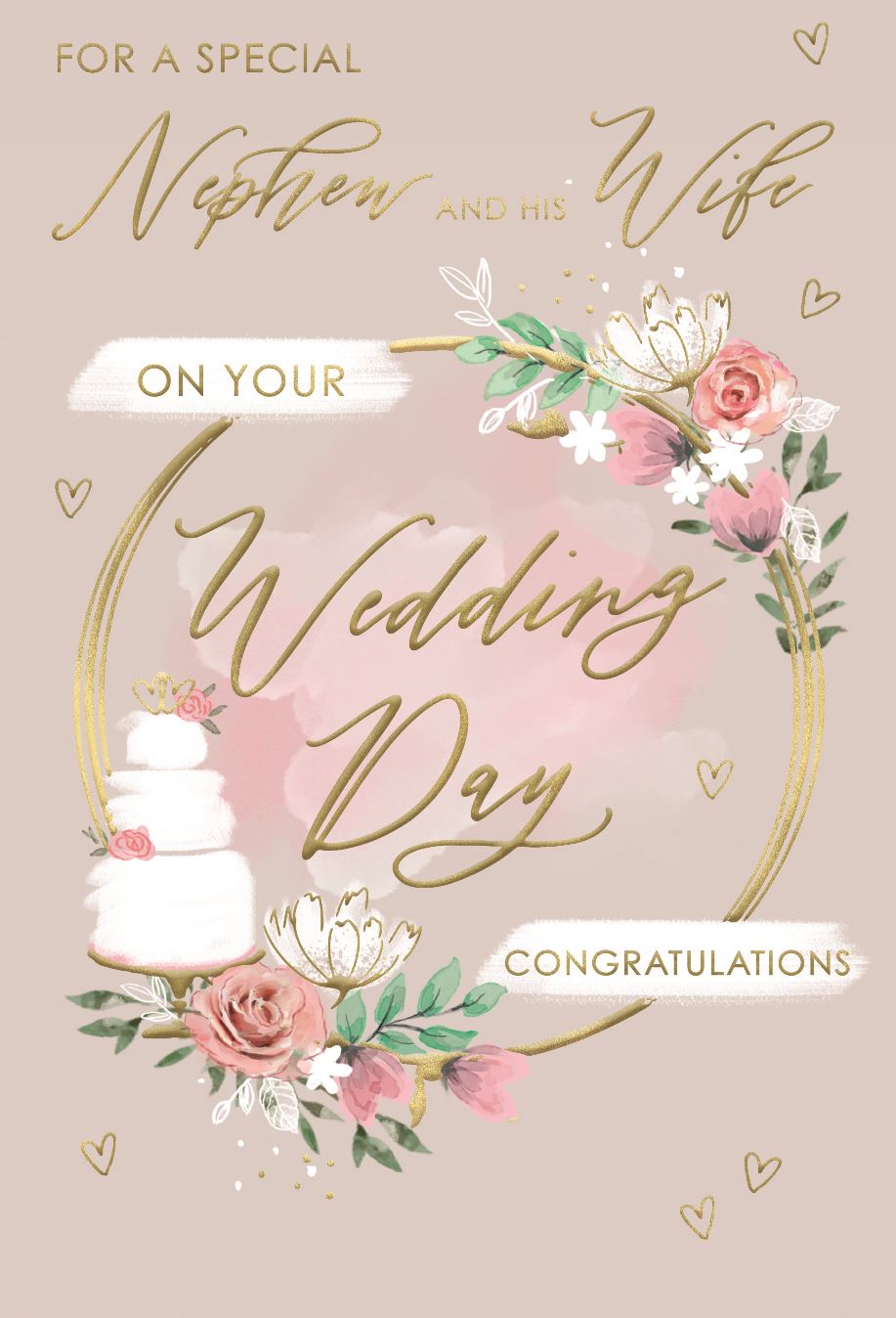 Nephew and Wife Wedding Card - Cake Ring - Flowers - Gold Foil