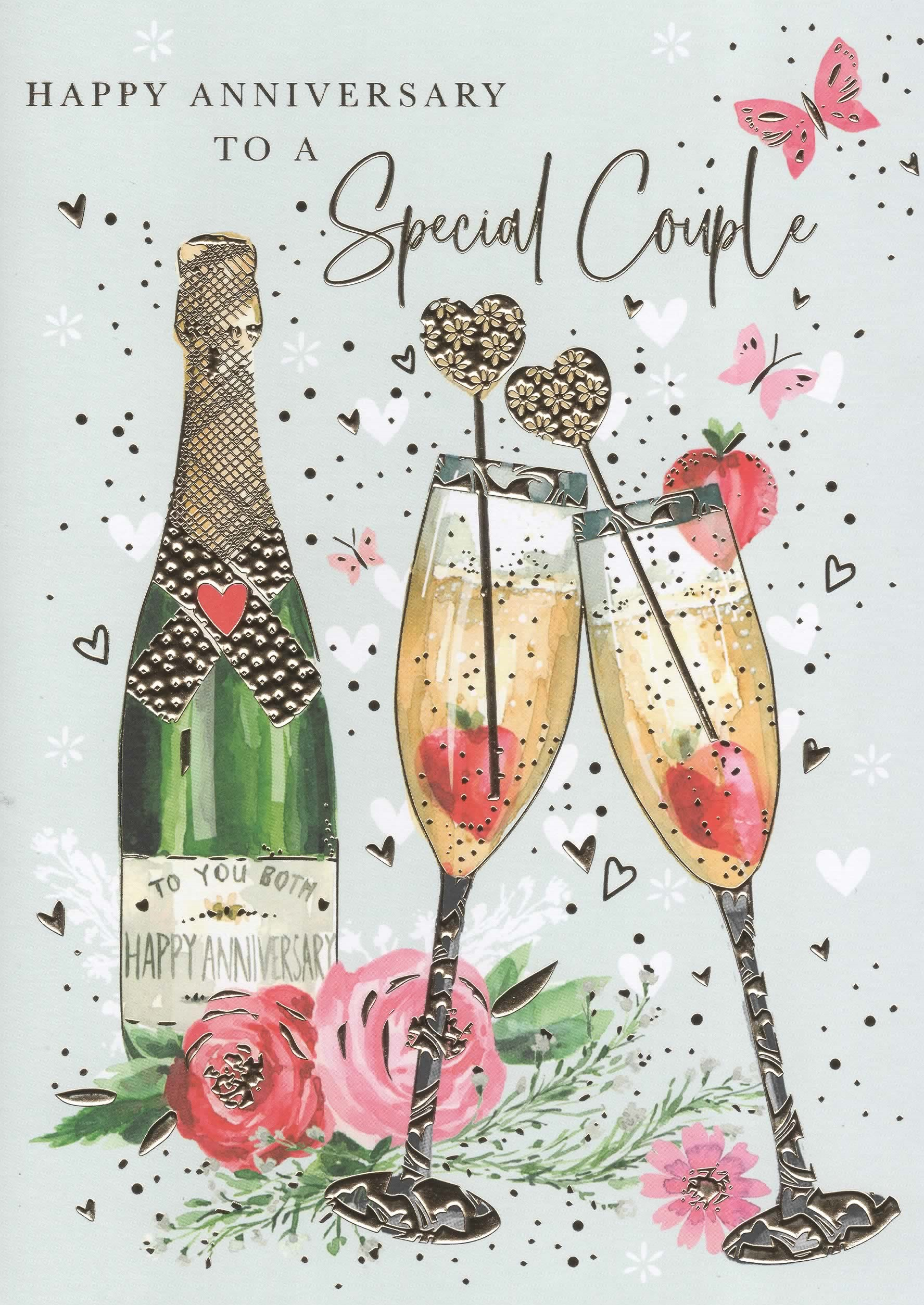 Verse reads: Here's a toast to both of you as you celebrate together, May the happy days that you share be ones to last forever. Anniversary wishes to a special couple