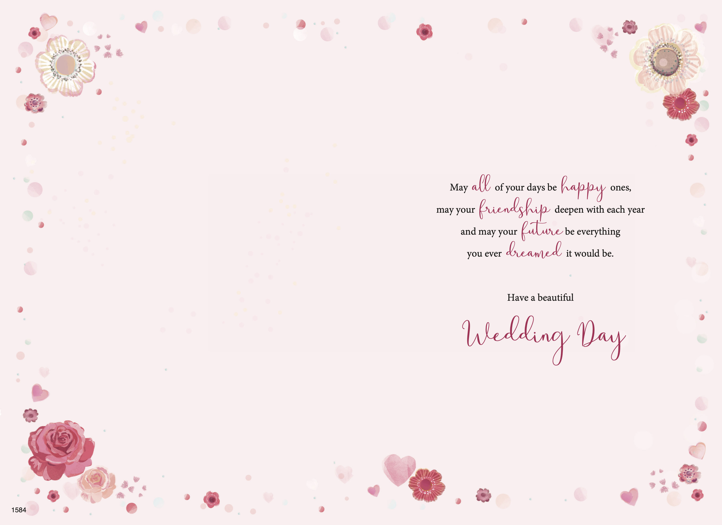 Verse reads: May all of your days be happy ones, may your friendship deepen with each year and may your future be everything you ever dreamed it would be. Have a beautiful Wedding Day