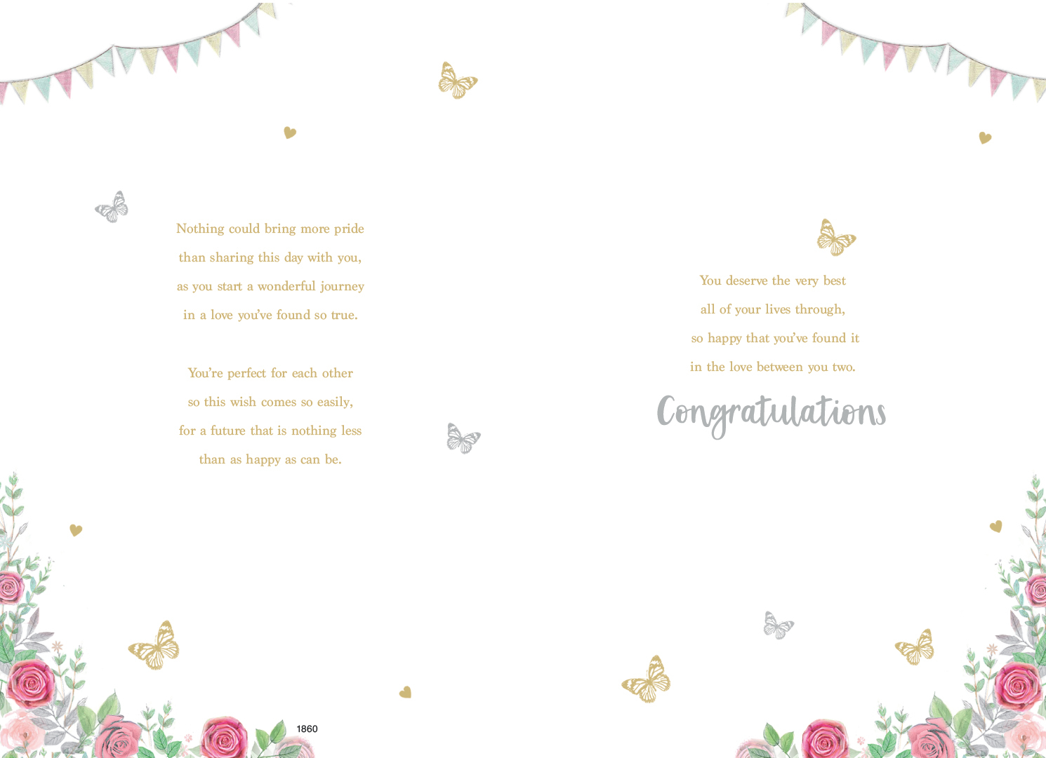 Verse reads: Nothing could bring more pride than sharing this day with you, as you start a wonderful journey in a love you've found so true. You're perfect for each other so this wish comes so easily, for a future that is nothing less than as happy as can be. You deserve the very best all of your lives through, so happy that you've found it in the love between you two. Congratulations