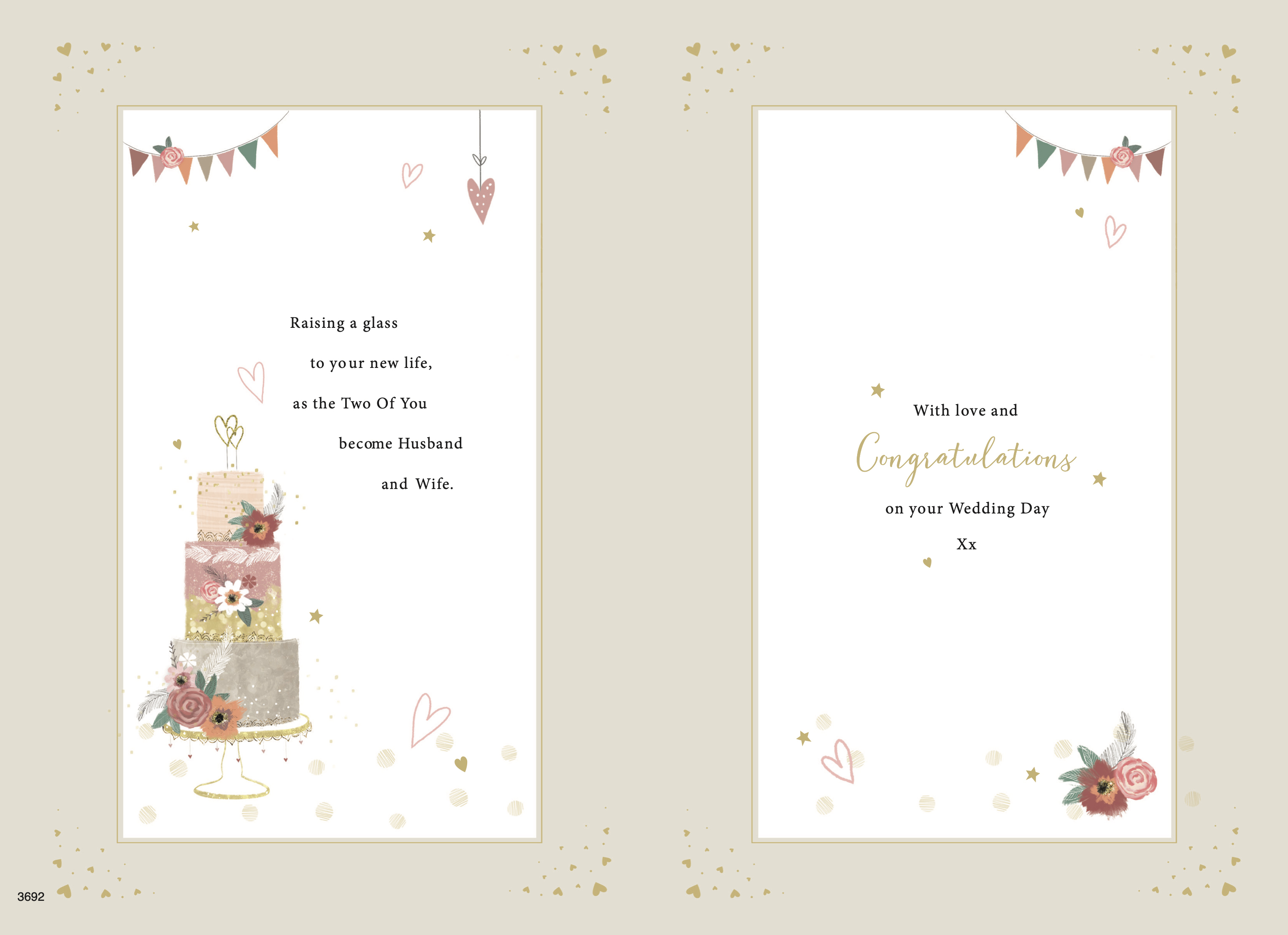 Verse reads: Front - Hoping that your Wedding Day is all you've wished and more and may it be the start of many happy years in store... Inside - Raising a glass to your new life, as the Two of You become Husband and Wife. With love and Congratulations on your Wedding Day Xx