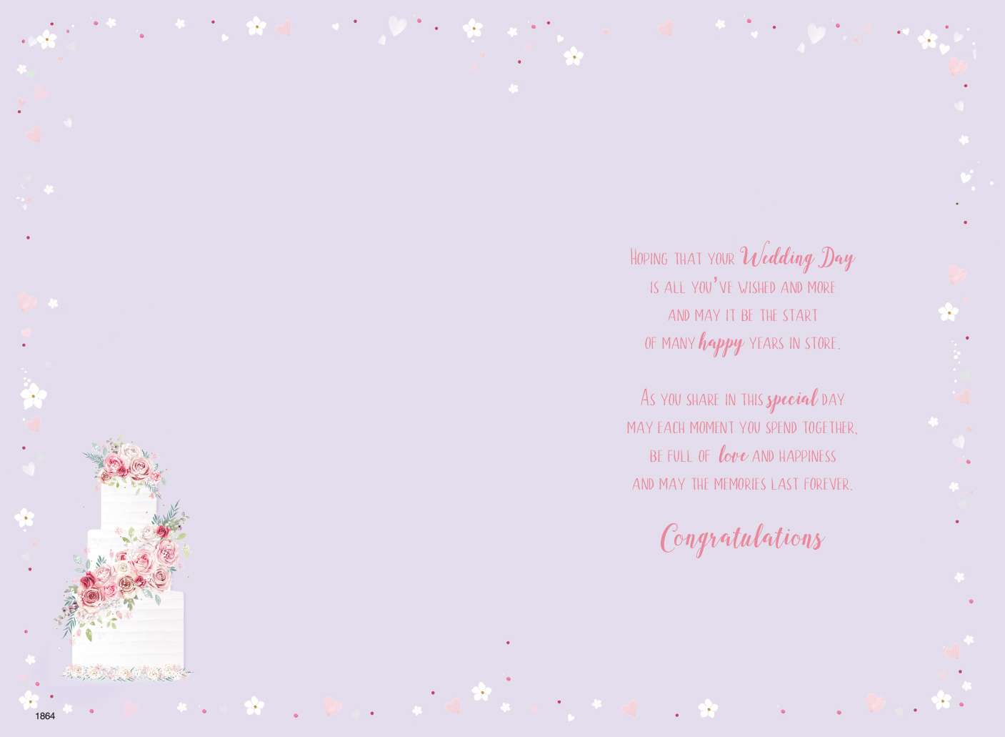 Verse reads: Hoping that your Wedding Day is all you've wished and more and may it be the start of many happy years in store, As you share this special day may each moment you spend together, be full of love and happiness and may the memories last forever. Congratulations.