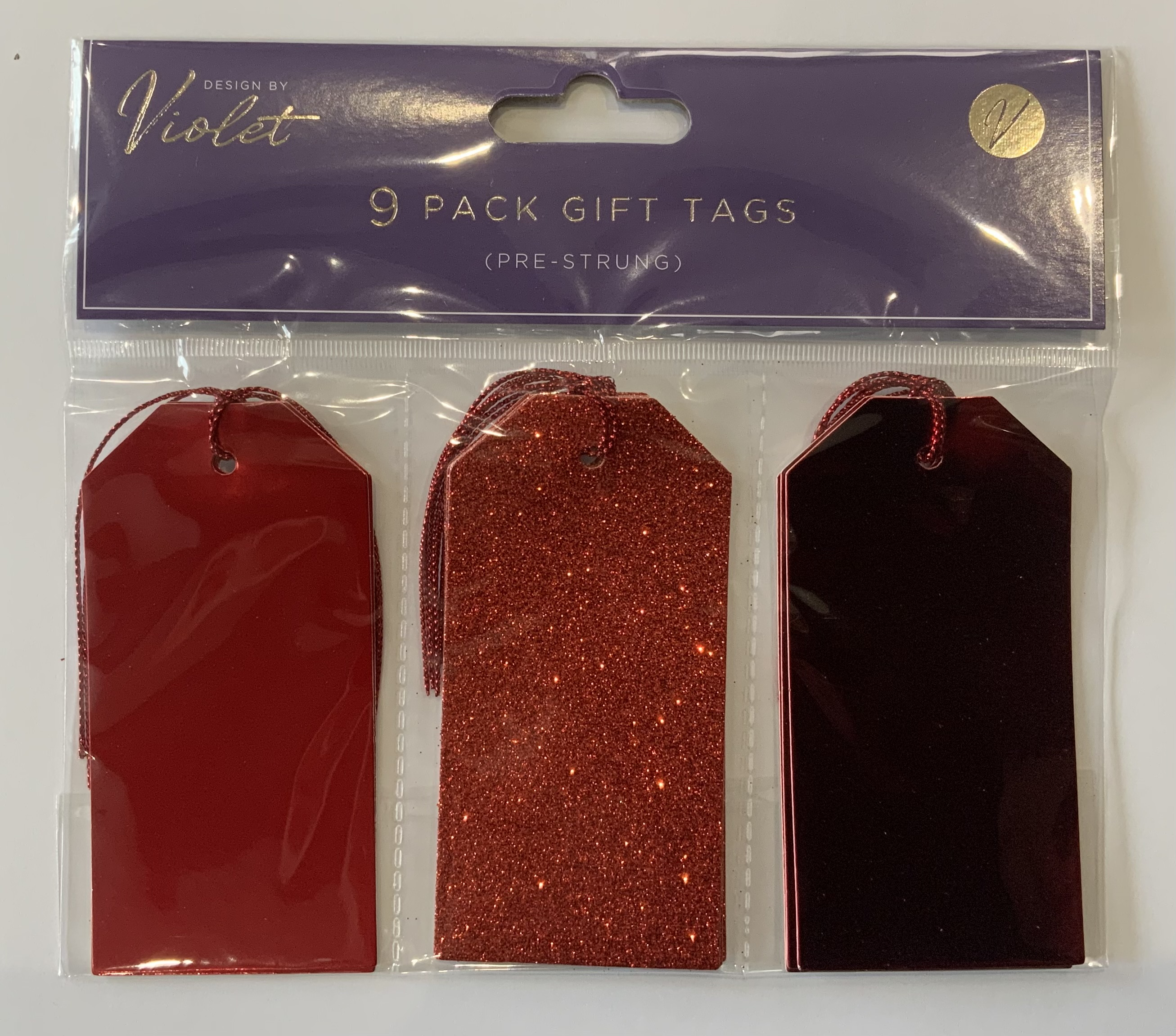 Christmas Gift Tags - Red - Matt - Shiny - Glitter - Pre-strung - 9 pk