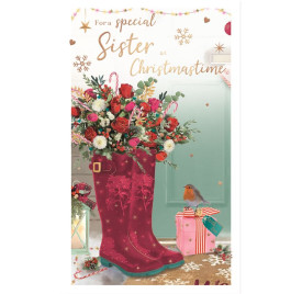 Sister Christmas Card - Red Wellington Boots - Floral - Robin