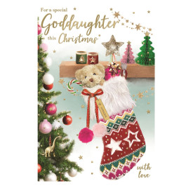 Goddaughter Christmas Card - Teddy Stocking - Hanging