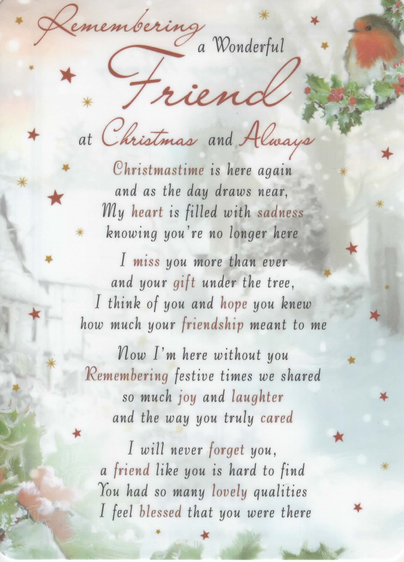 Verse reads: Christmastime is here again and as the day draws near, my heart is filled with sadness knowing you're no longer here I miss you more than ever and your gift under the tree, I think of you and hope you knew how much your friendship meant to me Now I'm here without you remembering festive times we shared so much joy and laughter and the way you truly cared I will never forget you, a friend like you is hard to find you had so many lovely qualities I feel blessed that you were there