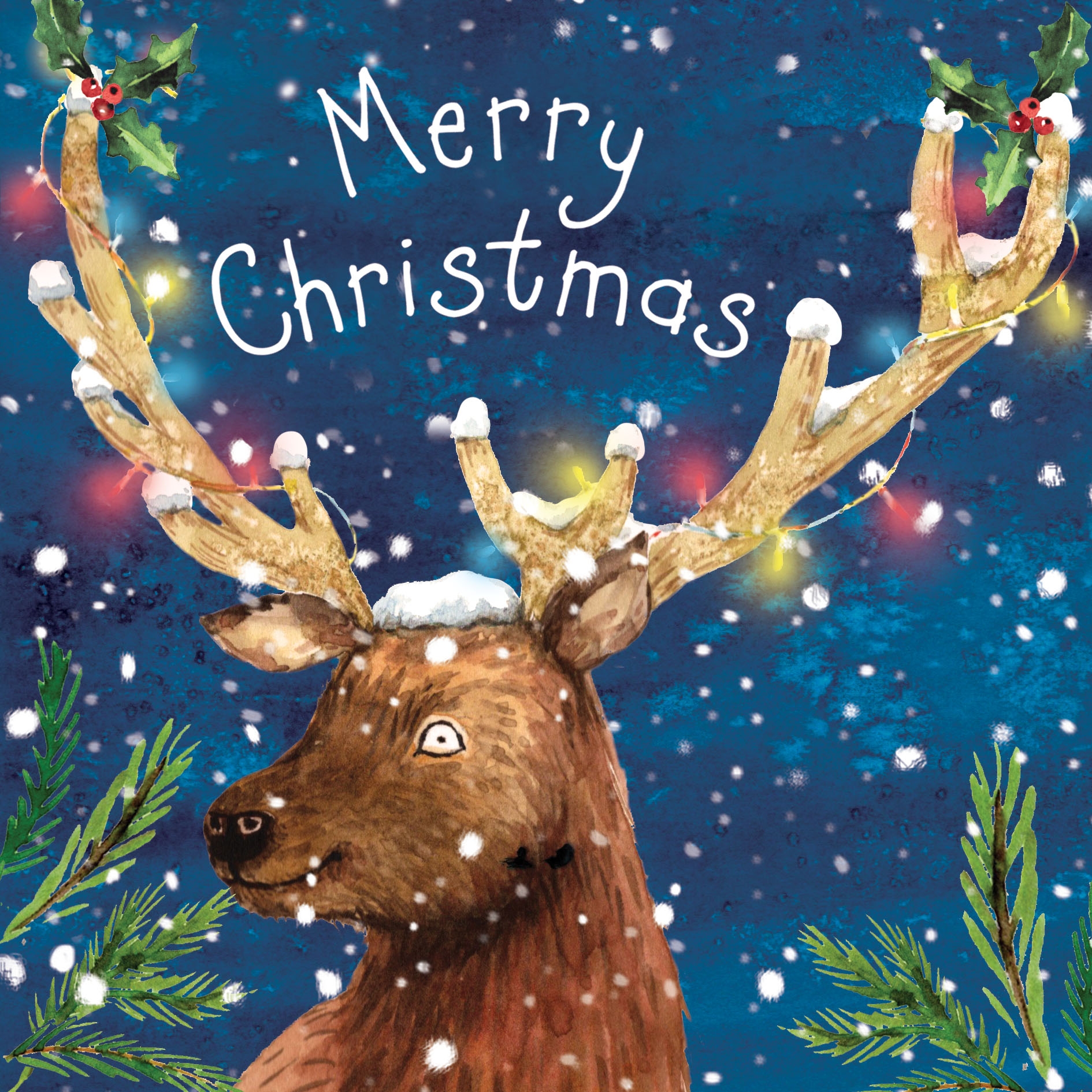 Merry Christmas - Reindeer with snow and lights on antlers.