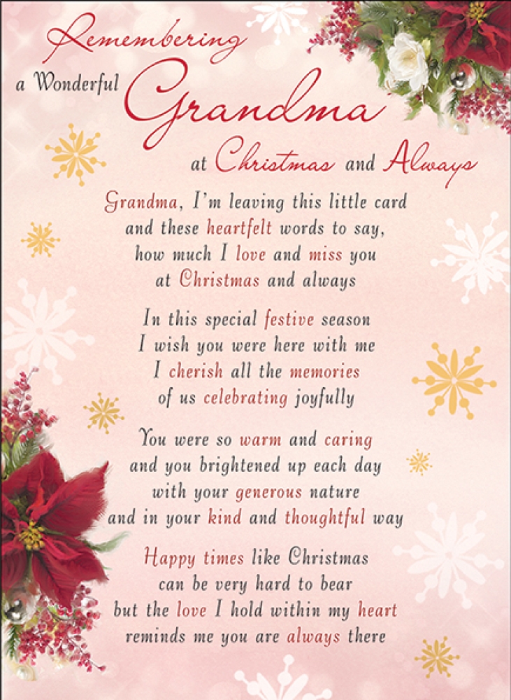 Verse reads: Grandma, I'm leaving this little card and these heartfelt words to say, how much I love and miss you at Christmas and always In this special festive season I wish you were here with me I cherish all the memories of us celebrating joyfully You were so warm and caring and you brightened up each day with your generous nature and in your kind and thoughtful way Happy times like Christmas can be very hard to bear but the love I hold within my heart reminds me you are always there
